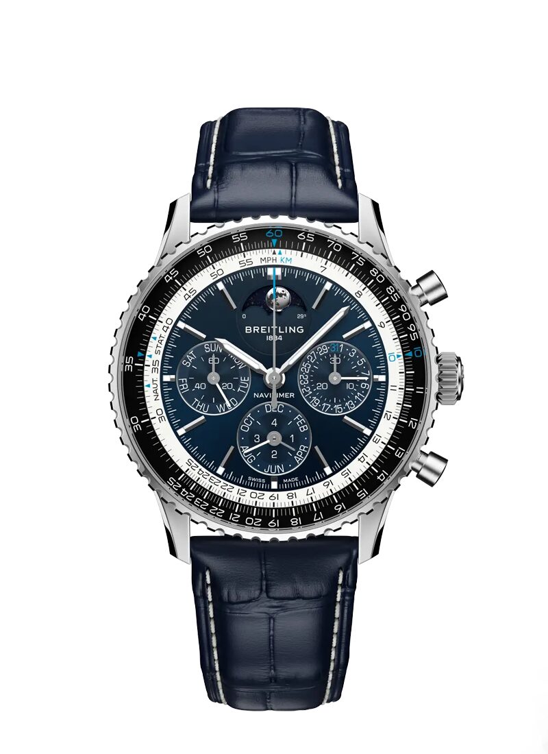 遠くから見ても一目でナビタイマーとわかる回転計算尺、バトンインデックス、3つのクロノグラフカウンター、操作しやすい刻み入りのベゼルを継承した伝統的ながらも新しいデザイン。