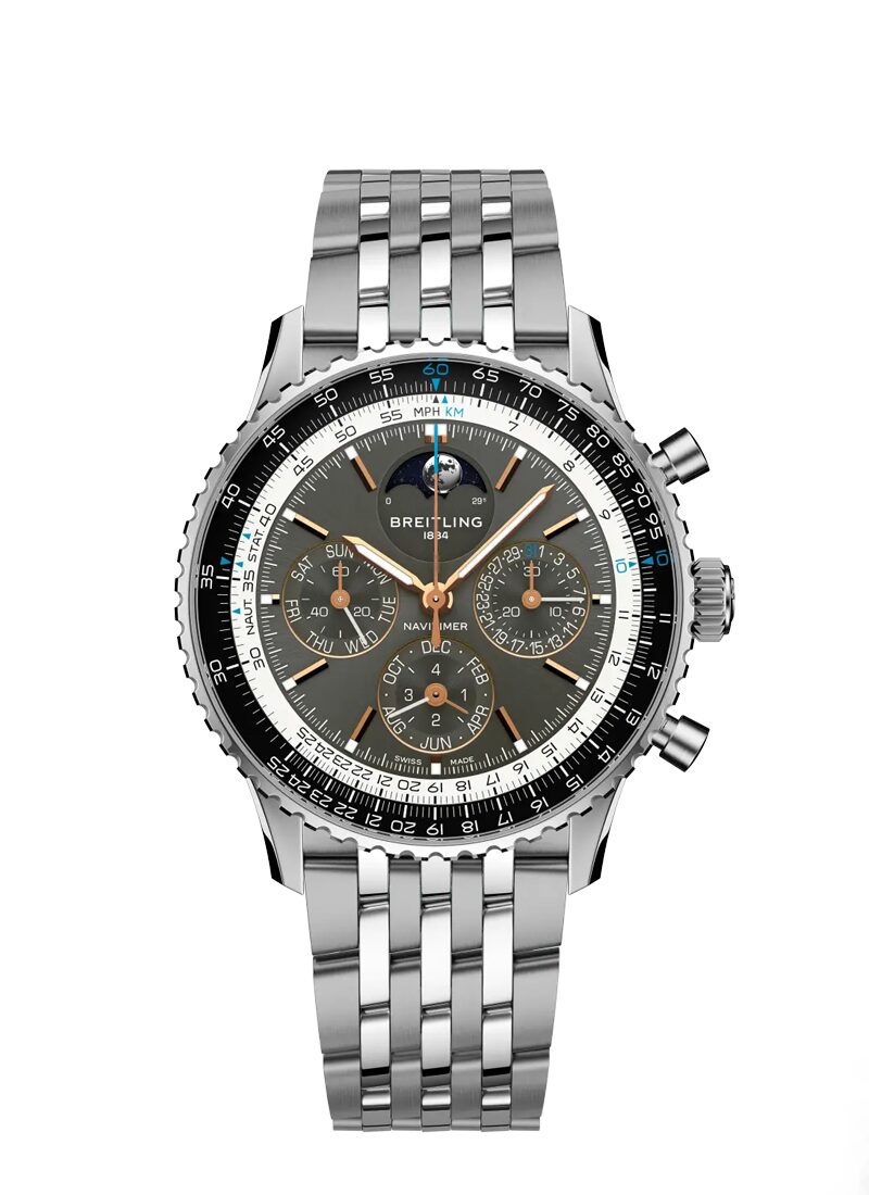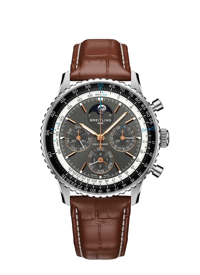 新しいナビタイマーは豊富なサイズ(46、43、41 mm)と2種類のケース素材(ステンレススチール、18Kレッドゴールド)をご用意しました。