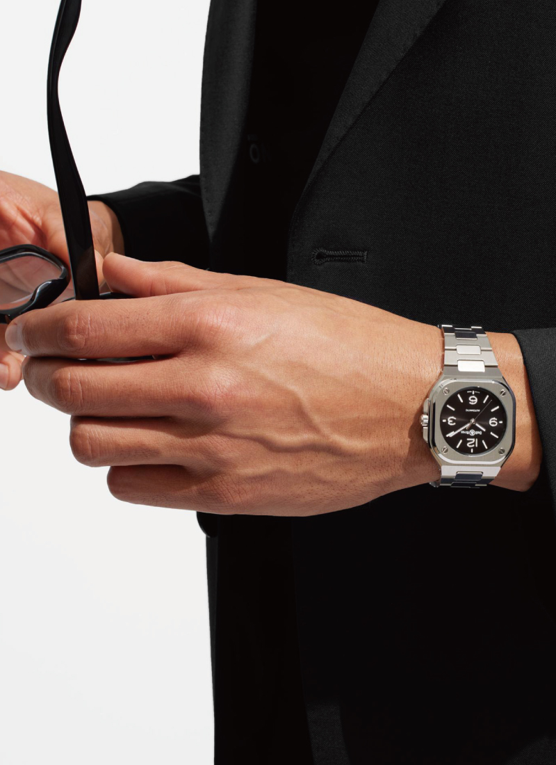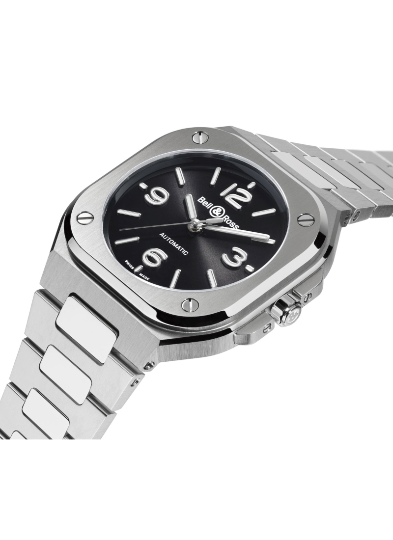 BR-05 36MMは、光沢のあるサンレイ仕上げのブラックダイアルを備え、ポリッシュとサテン仕上げが交互に施されたステンレススチール製ケースが特徴。