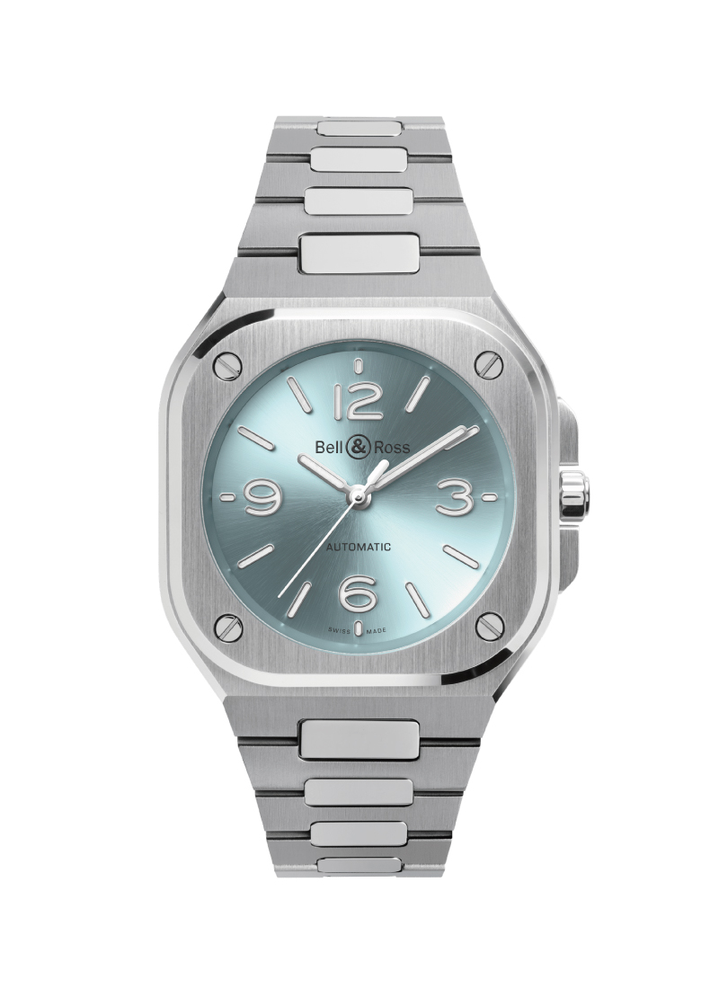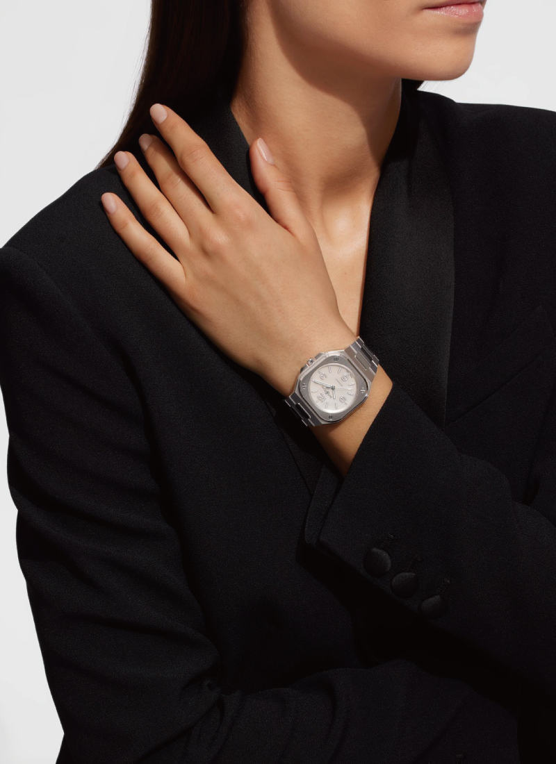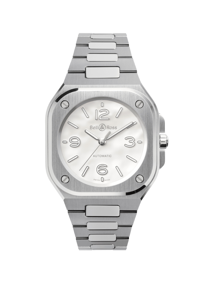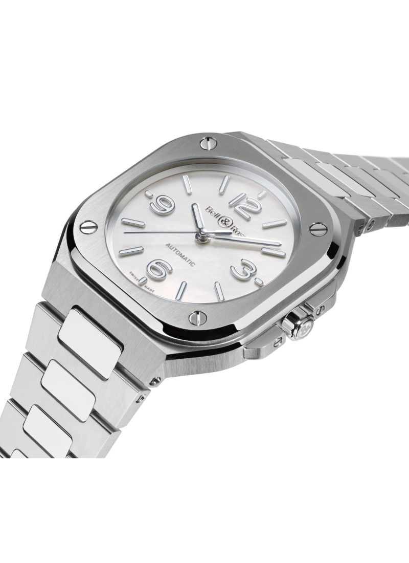BR-05 36MMは、グレードAのマザーオブパールダイアルを採用。ポリッシュとサテン仕上げが交互に施されたステンレススチール製ケースが特徴です。その美しい仕上げは、抜群の着け心地を誇るブレスレットと調和しています。