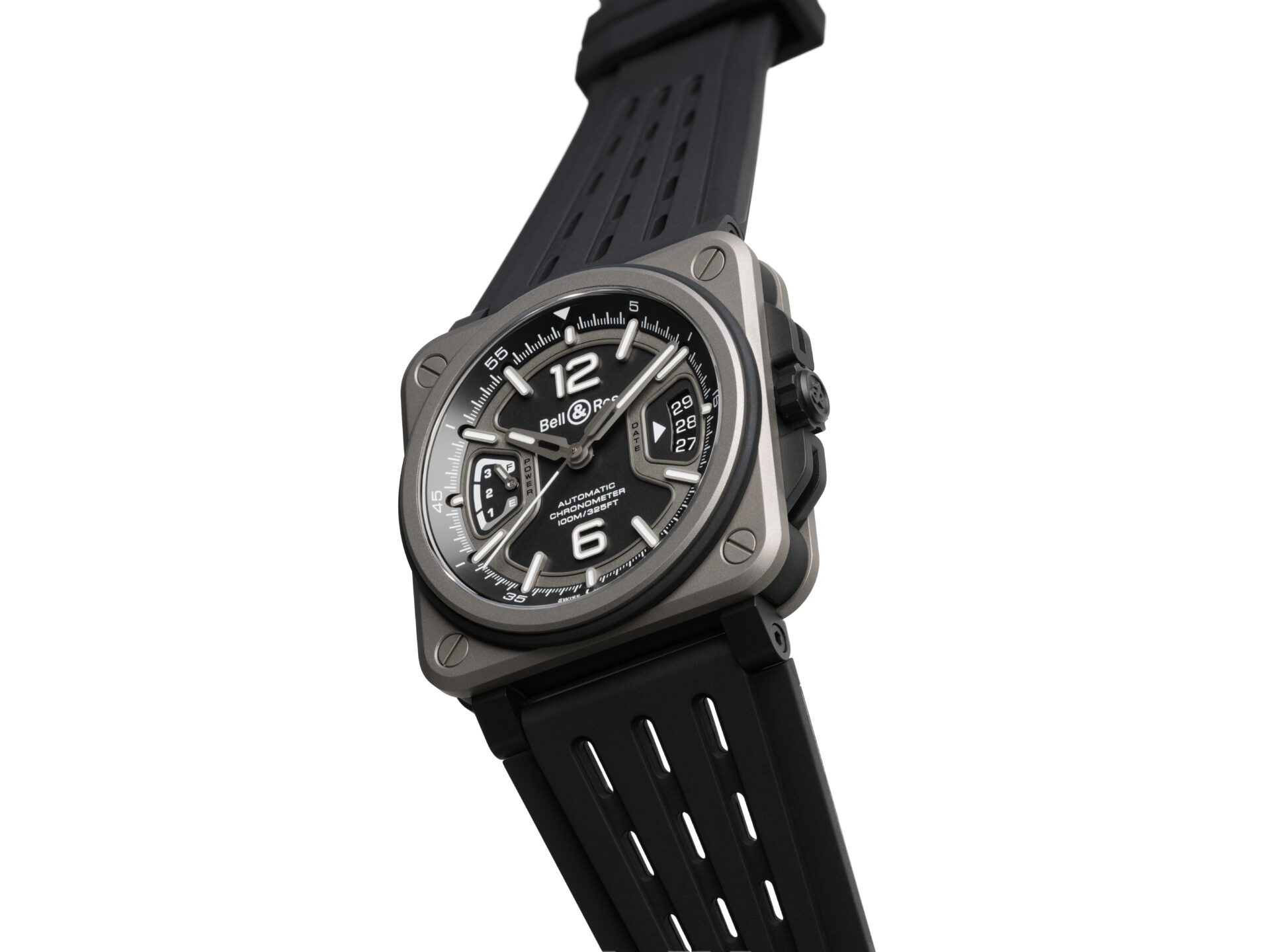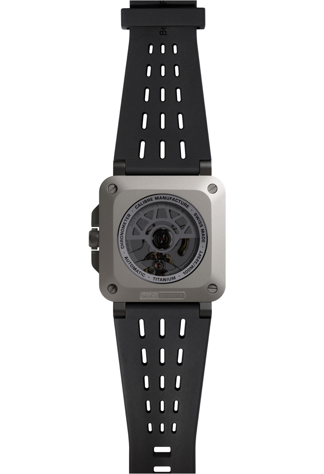 BR-X3 Titaniumは軽さと耐久性を極め、多層チタンケースのサンドイッチ構造により、高度な技術と快適さを両立させています。文字盤は印象的なX型デザイン。3時位置のデイト表示と9時位置のパワーリザーブはマットグレーで縁取られています。60分目盛り付きのフランジにセットしたメタルインデックスと蓄光針により、昼夜を問わず文字盤の視認性を実現しました。