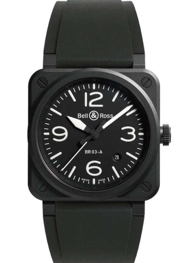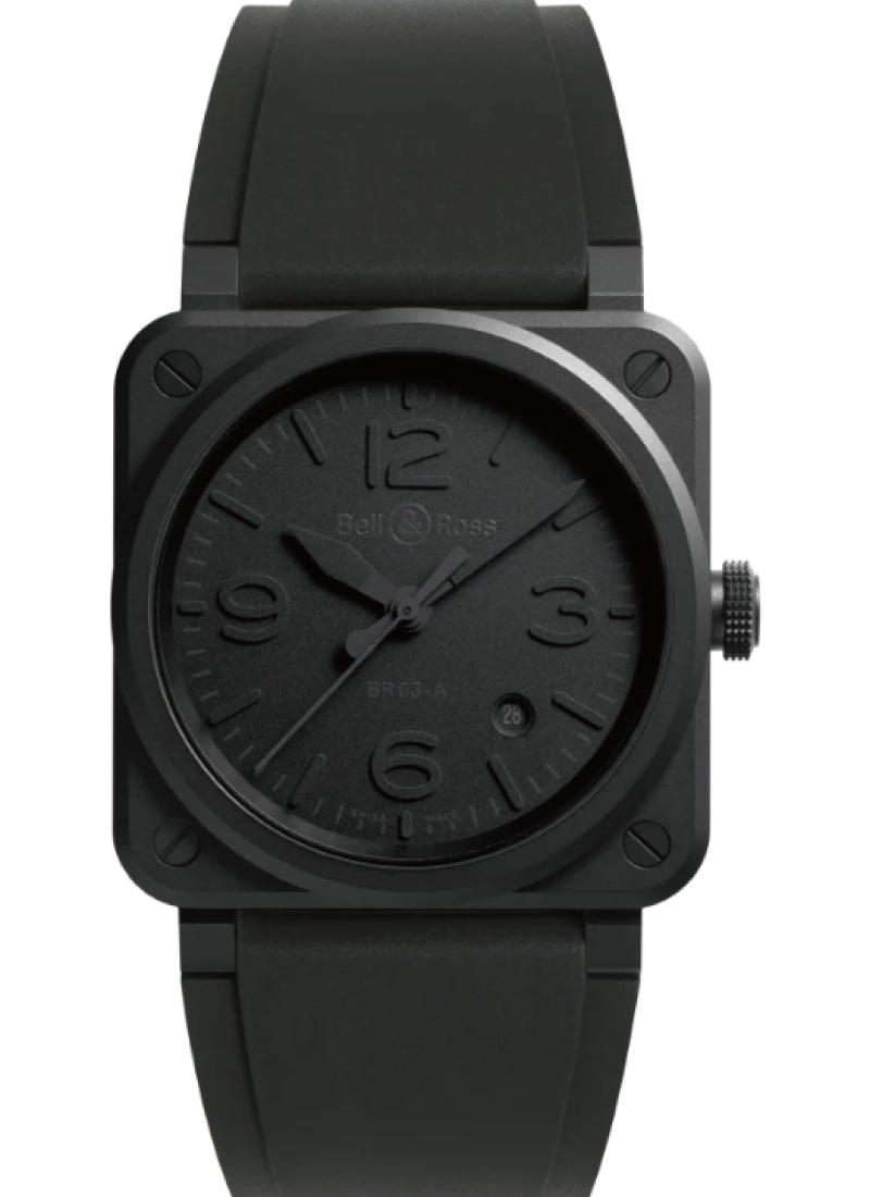 航空の世界にインスパイアされた美学と洗練された航空デザイン理念で知られる Bell & Ross は、高い品質を誇るラ・ショー・ド・フォンで時計を製造しています。BR 03-92 コレクションは、コックピット計器を思わせる独創的なブラックセラミックまたはステンレススティール製スクエアケースを装備し、空軍から求められる仕様を再現しています。BR 03-92 ウォッチは、自動巻きムーブメント、アプライドメタルのインデックスと数字を配したブラックダイヤル、マットブラック セラミック製スクエアケース、反射防止加工を施したサファイアクリスタルのカバーガラス、100m 防水、ステンレススティール製ピンバックル付きの耐久性に優れたブラック ラバーストラップ(より軽量なファブリックストラップに交換可能)を備えています。時、分、秒のほか、便利な日付表示もついています。これらにはすべて、最適な視認性を保つため夜光塗料がコーティングされています。