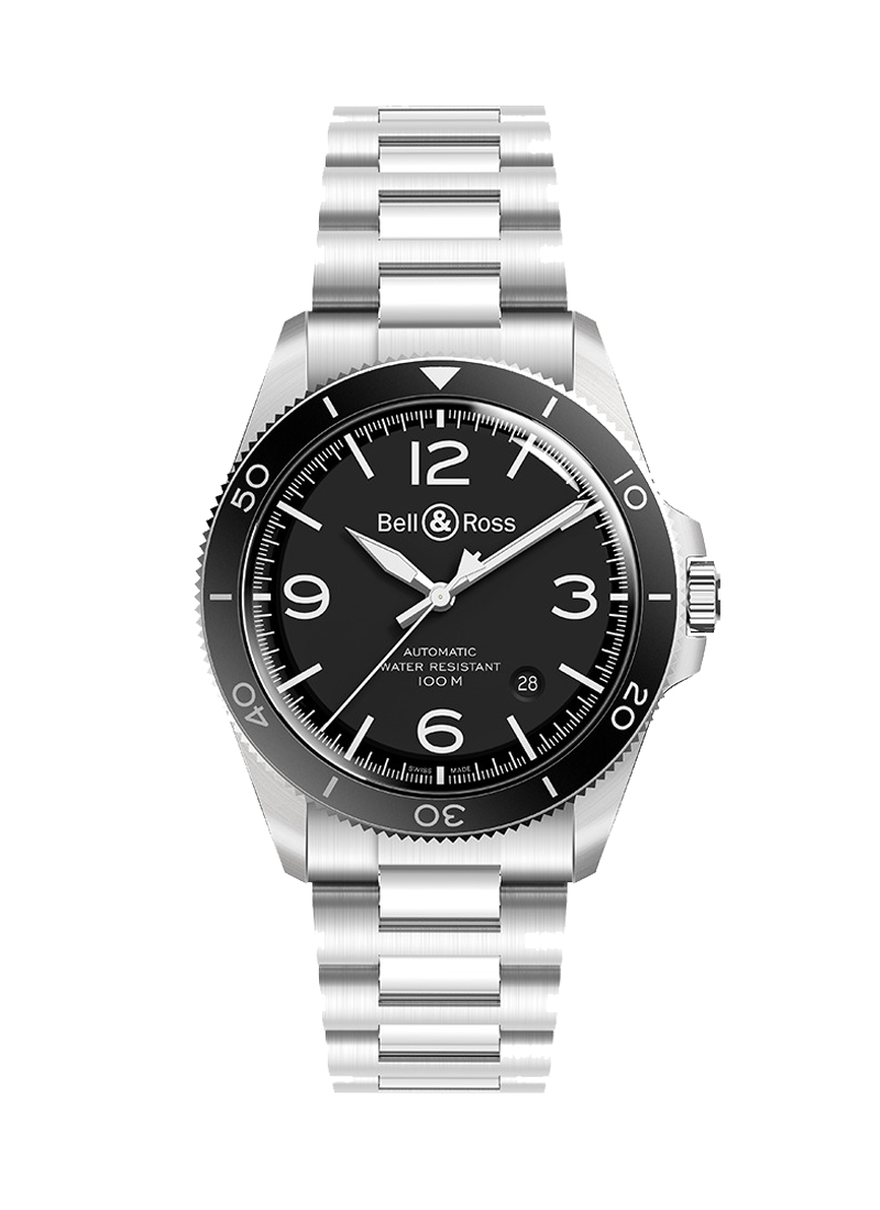 BR V2-92 は3本の針で時、分、秒を表示します。両方向回転式ベ ゼルにより、短いインターバルの時間計測を継続的に行うことが できます。