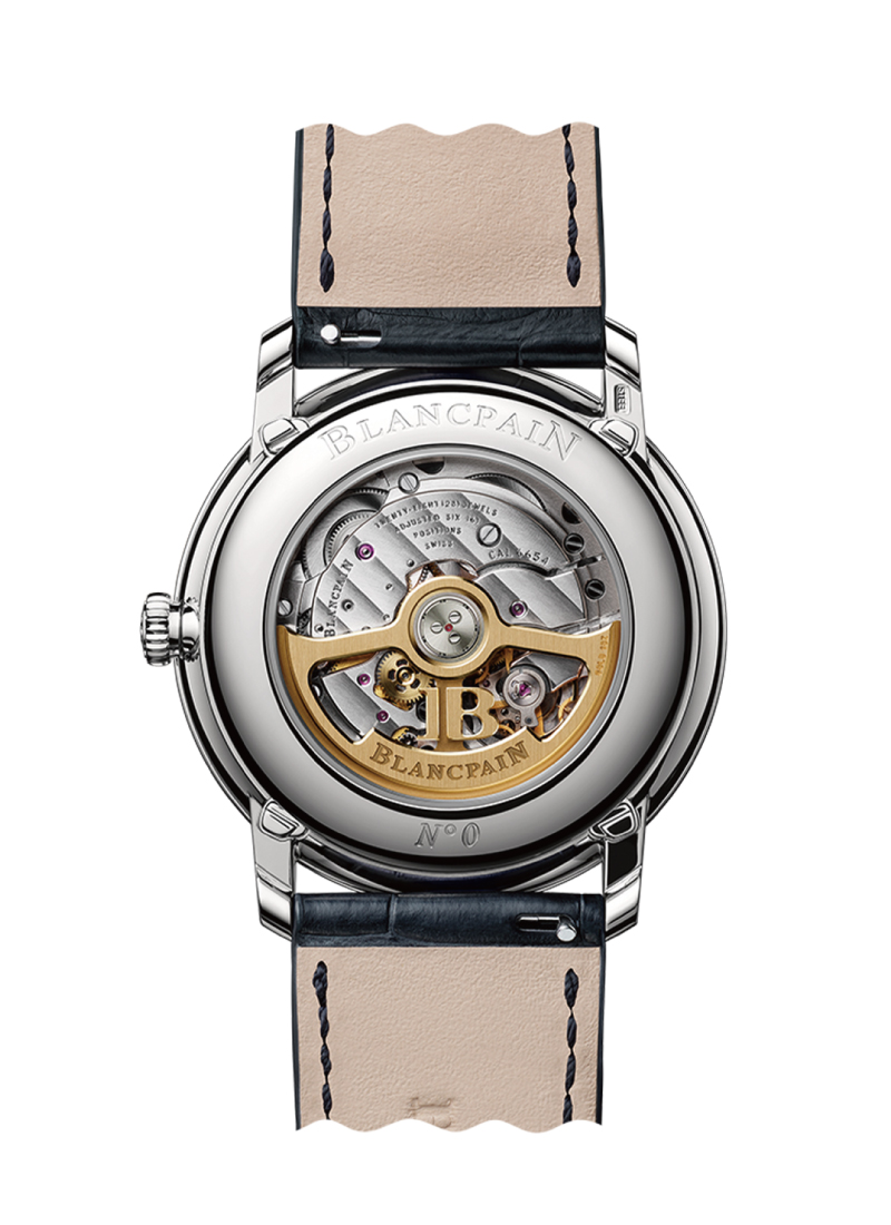 複雑なカレンダー機構を確実に保護するため、キャリバー6654が搭載されており、指で押すだけで操作できるブランパンの特許技術アンダーラグ・コレクターを用い、カレンダー表示をいつでも調整することができます。