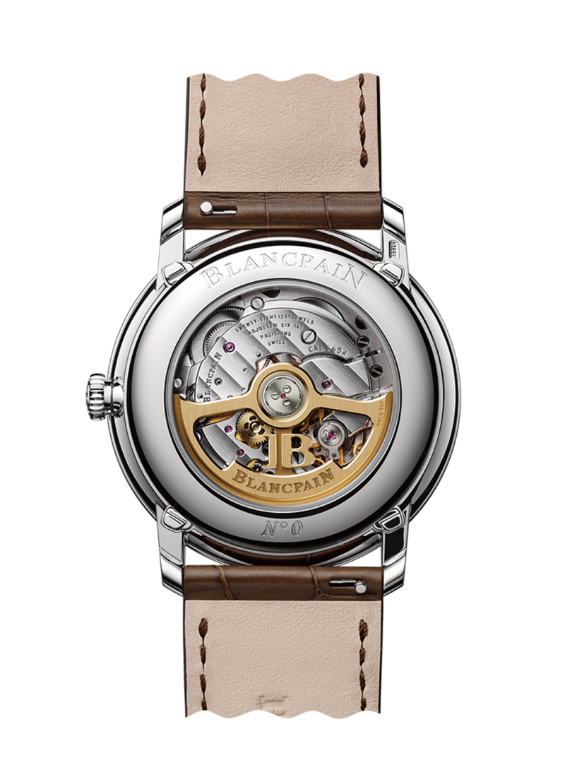 複雑なカレンダー機構を確実に保護するため、キャリバー6654が搭載されており、指で押すだけで操作できるブランパンの特許技術アンダーラグ・コレクターを用い、カレンダー表示をいつでも調整することができます。