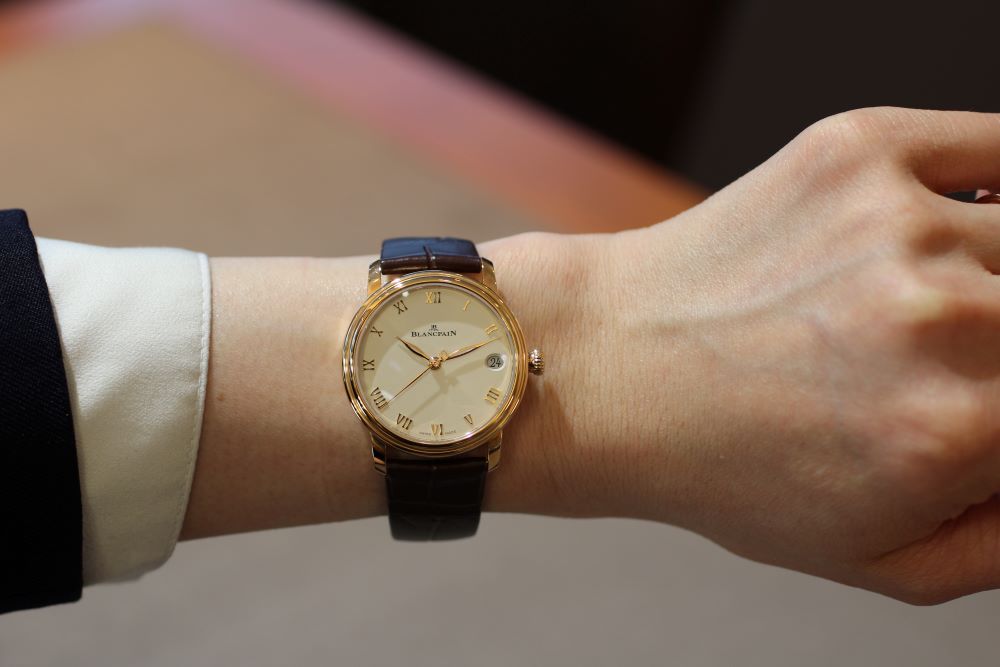 ホワイトの文字盤にレッドゴールドのローマ数字が上品に並びます。