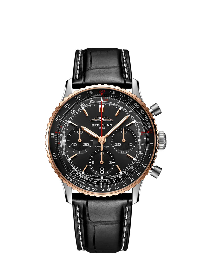 回転計算尺のインナーベゼルからストラップまでブラックで統一することで、視覚的に引き締まった印象を与え、レッドゴールドの輝きを一層際立たせる、洗練された力強い美しさを表現しています。また、ブラックダイヤルはパイロットウォッチらしい実用的なカラーであり、シルバーとホワイトのインデックスや針、そしてナビタイマーの証である回転計算尺の目盛りとのコントラストによって、高い視認性を確保できます。