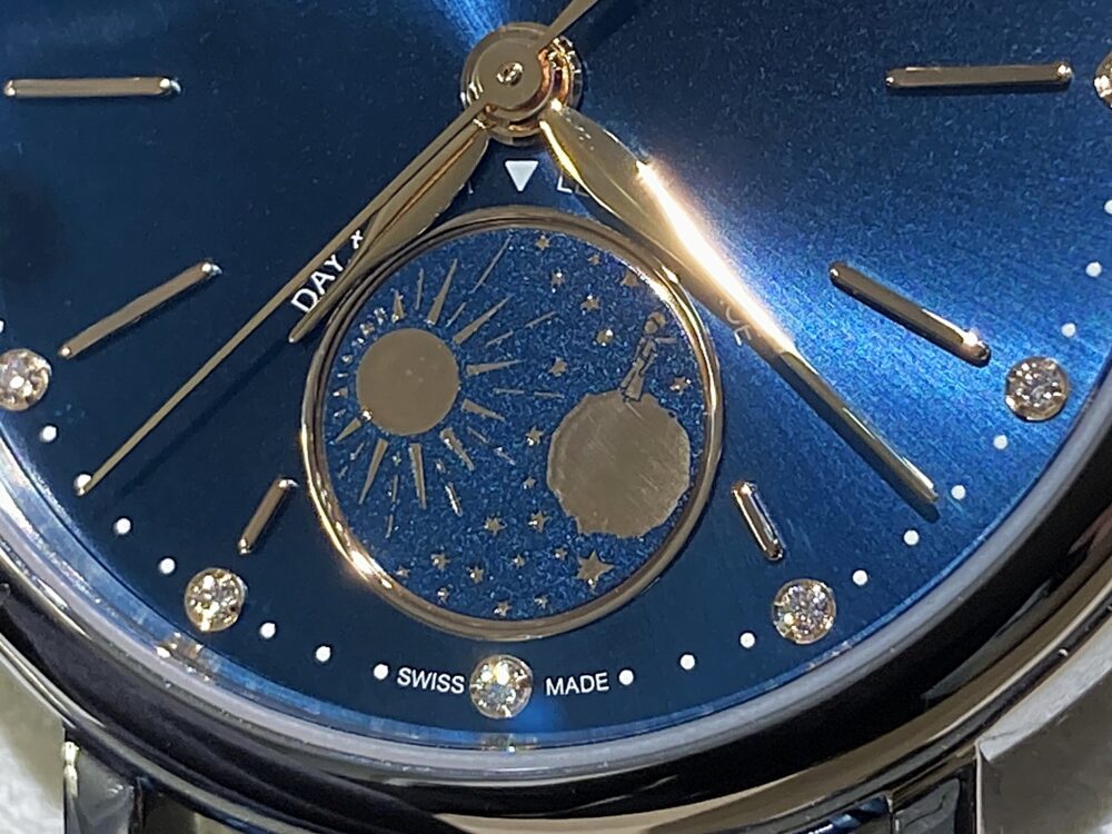 星の王子さまモデルと言えば、裏蓋に刻印されたイラストが思い浮かびますが、このモデルはデイ&ナイト表示の小さな月に立つという形でデザインされています。原作でも王子さまの生まれはとても小さな星でしたから、非常に粋なデザインですよね!