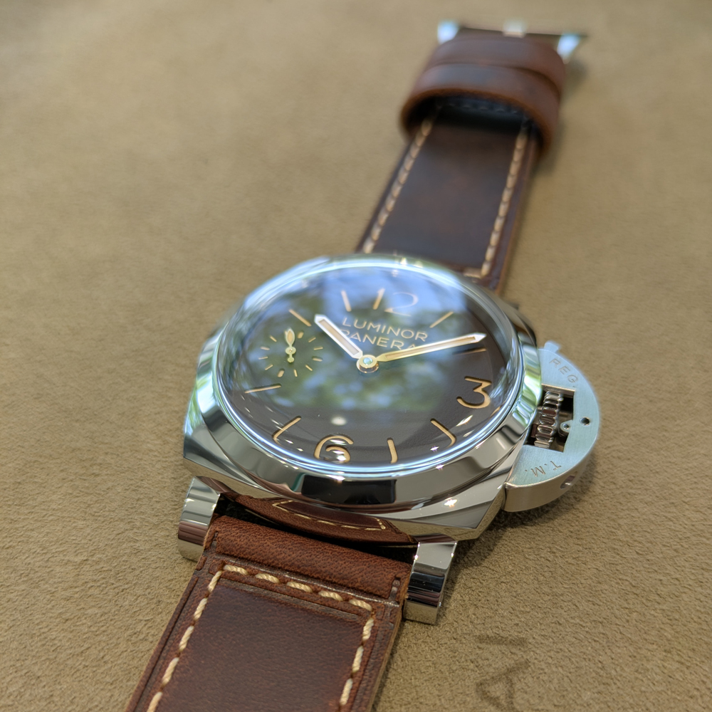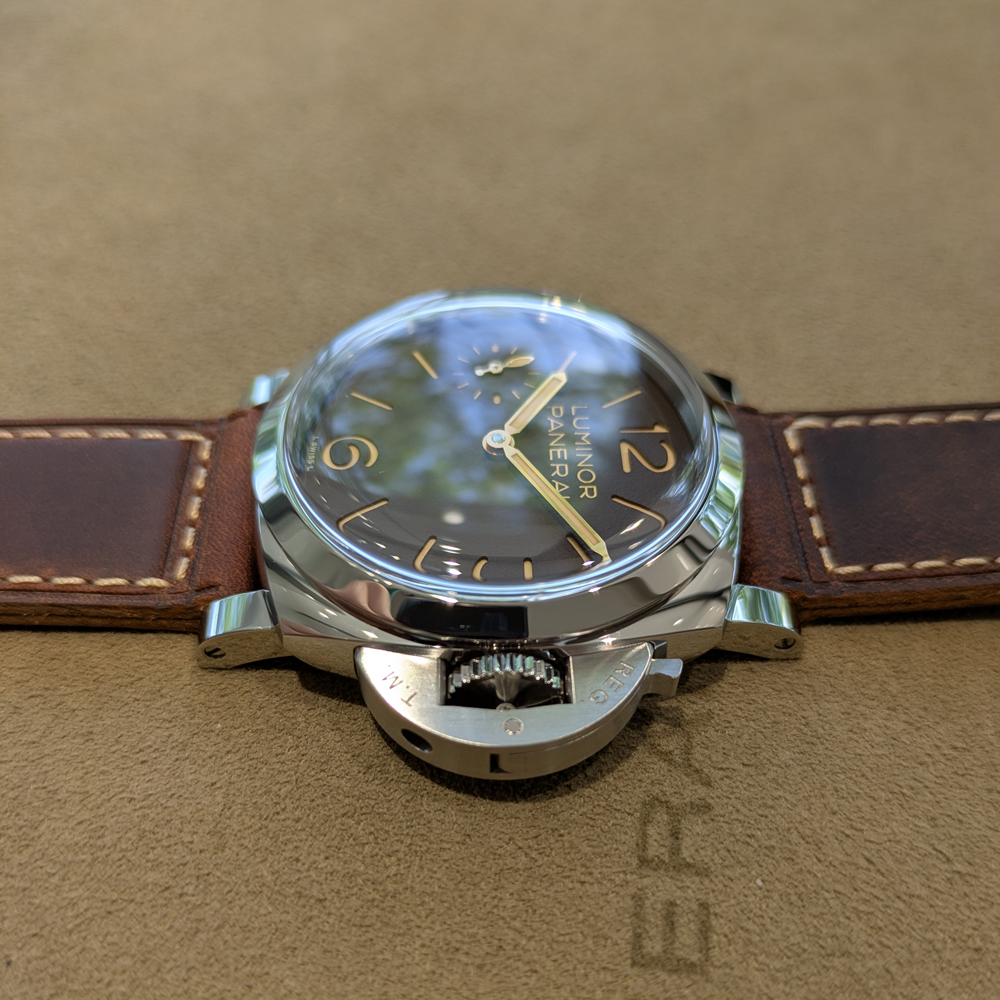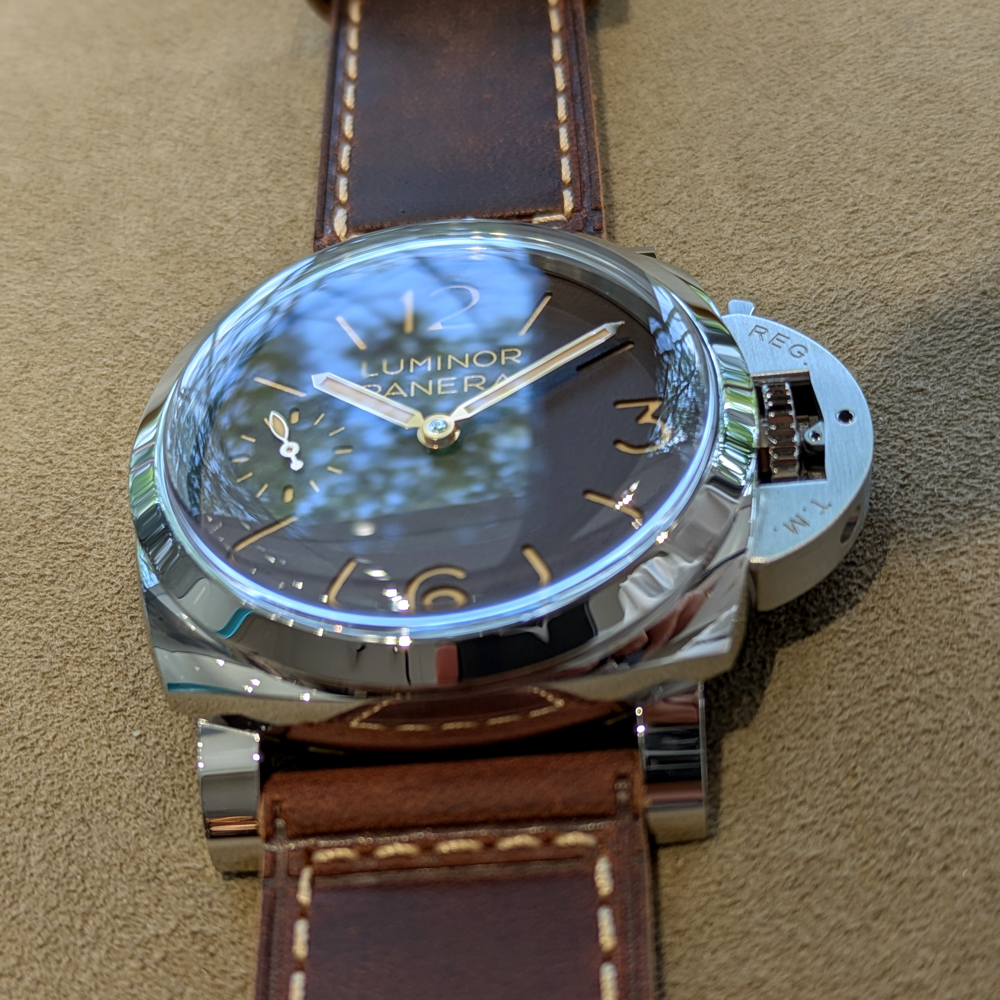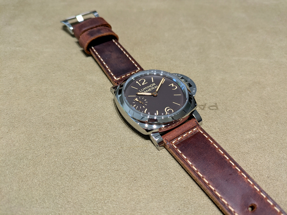 ドーム型ガラス、サンドイッチ文字盤、シースルーバック、そして300M防水という、パネライに求める「正解」がすべて詰まっています。何より、発表当日の今日から店頭に並んでいるというサプライズ。