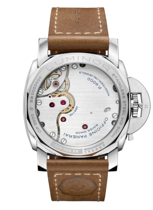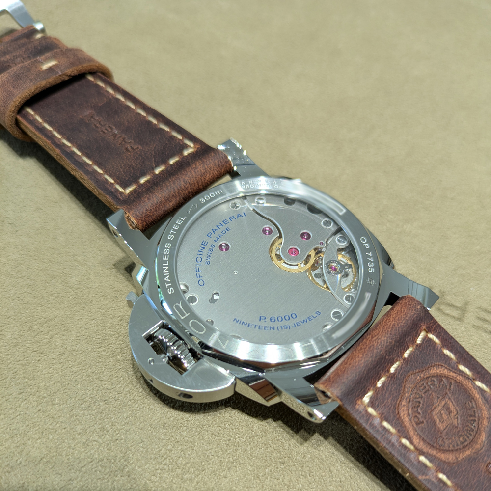 心臓部には、パネライ自社製の手巻きキャリバー「P.6000」を搭載。シングルバレルでありながら、3日間のロングパワーリザーブを確保しており、手巻きならではの操作感と現代的な実用性を両立させています。