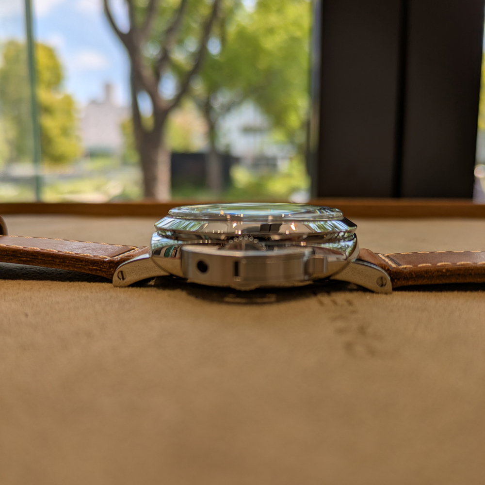 風防にはドーム型のサファイアクリスタルを採用。これにより、横から眺めた際にも美しい歪みが生まれ、アンティークウォッチのような柔らかな雰囲気を醸し出しています。