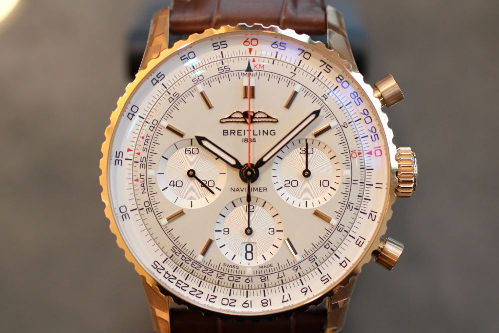 ステンレススチールのモデルとはまた違う雰囲気を持つ特別なナビタイマー、1年頑張った自分へのご褒美にいかがでしょうか。
