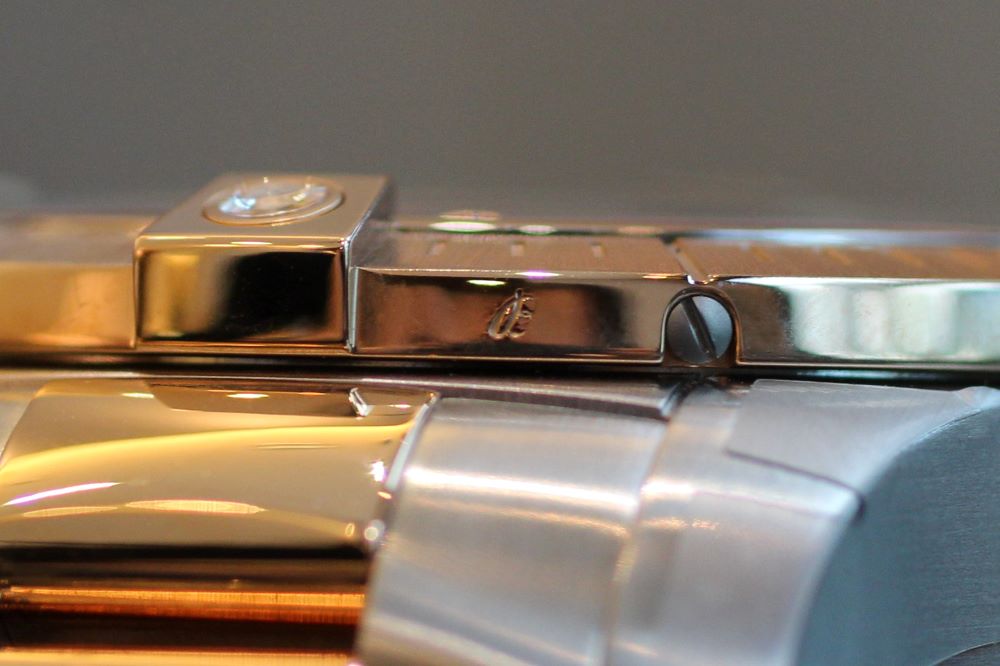 サテン仕上げのステンレススチール部分よりもポリッシュ仕上げのレッドゴールドの面積が広いので、