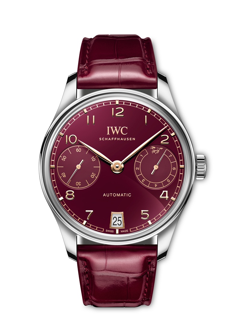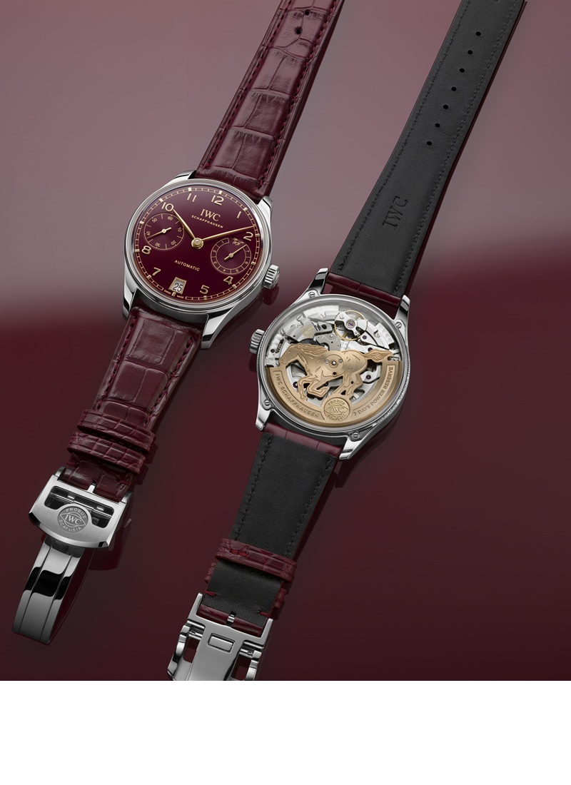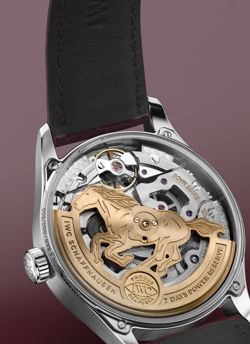 「ポルトギーゼ・オートマティック 42 “イヤー・オブ・ザ・ホース”」には、ステンレススティール製ケース、バーガンディの文字盤、そしてゴールドの針とアップライト・インデックスが採用されています。IWC自社製キャリバー52011のローター(自動巻き上げ機構の回転錘)は、駆ける馬の姿を象ったデザインで、旧正月を祝福しています。限定500本