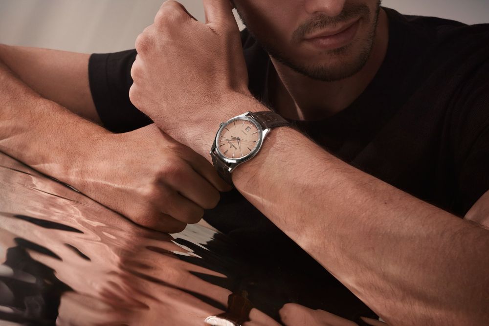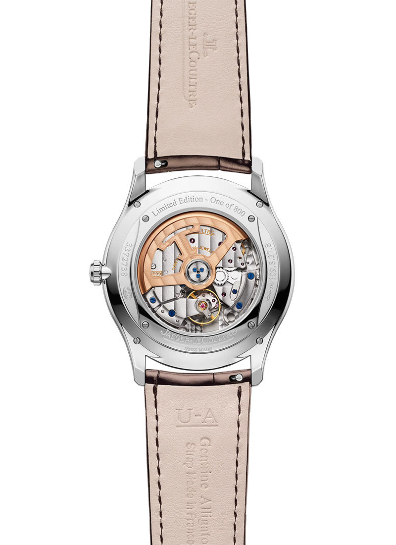 マスター・ウルトラスリム・デイトは、39 mmのステンレススチールケースと厚さ僅か7.8 mmの極薄形状で、磨き抜かれたエレガンスを体現します。グレイン仕上げコッパーカラーダイヤルには6時位置に日付表示がさりげなく配され、シンメトリーと調和をダイヤル上で美しく織りなします。片面にサテンブラッシュ、もう片面にはポリッシュを施したドーフィン針の緻密な仕上げが、スレンダーな台形インデックスの形状と美しく響き合い、捉えた光が魅惑的な煌めきの戯れを生み出します。このモデルにはステンレススチール製フォールディング・クラスプを備えたブラウンアリゲーターストラップを組み合わせ、装いやシーンに応じた容易な取り替えを可能にするインターチェンジャブルシステムが、幅広い汎用性をもたらします。タイムピースの裏面では設計から組み立て、そして装飾まで、全工程をメゾンのひとつ屋根の下で司るマニュファクチュール製キャリバー899の魅力を余すことなく解き放ちます。キャリバーに施されたコート・ド・ジュネーブ装飾、面取り、青焼きネジなどの繊細な仕上げが、視覚と感性に豊かな余韻を響かせます。