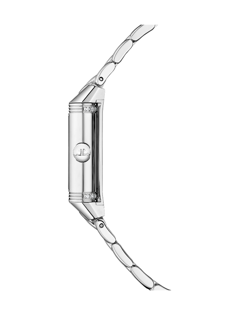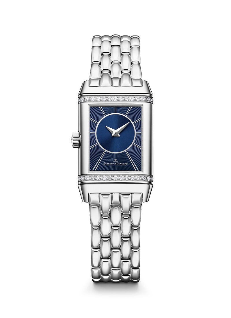 アールデコを象徴するゴドロン装飾様式が際立つ、34.2 x 21 mmの絶妙なプロポーションが美しいステンレススチール製ケースのレベルソ・クラシック・スモール・デュエット。ダブルフェイスでエレガンスを多彩に表現するタイムピースです。表ダイヤルにはダイヤルおよびケースと調和する同系色のトーンでアラビア数字とロゴを配し、二種の仕上げが織りなす双奏が、豊かな表情を生み出します。反転させると現れるのは、独創的なブルーの裏ダイヤル。インデックスには二本線を放射状に配し、中央に施したサンレイブラッシュ仕上げがダイヤルに奥行きと立体感を添えています。心臓部ではマニュファクチュール製手巻きキャリバー844が鼓動を刻むこのタイムピースは、50時間のパワーリザーブを確保します。