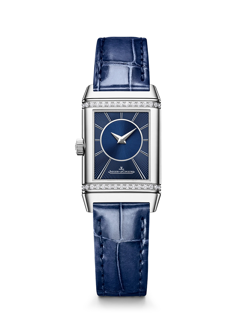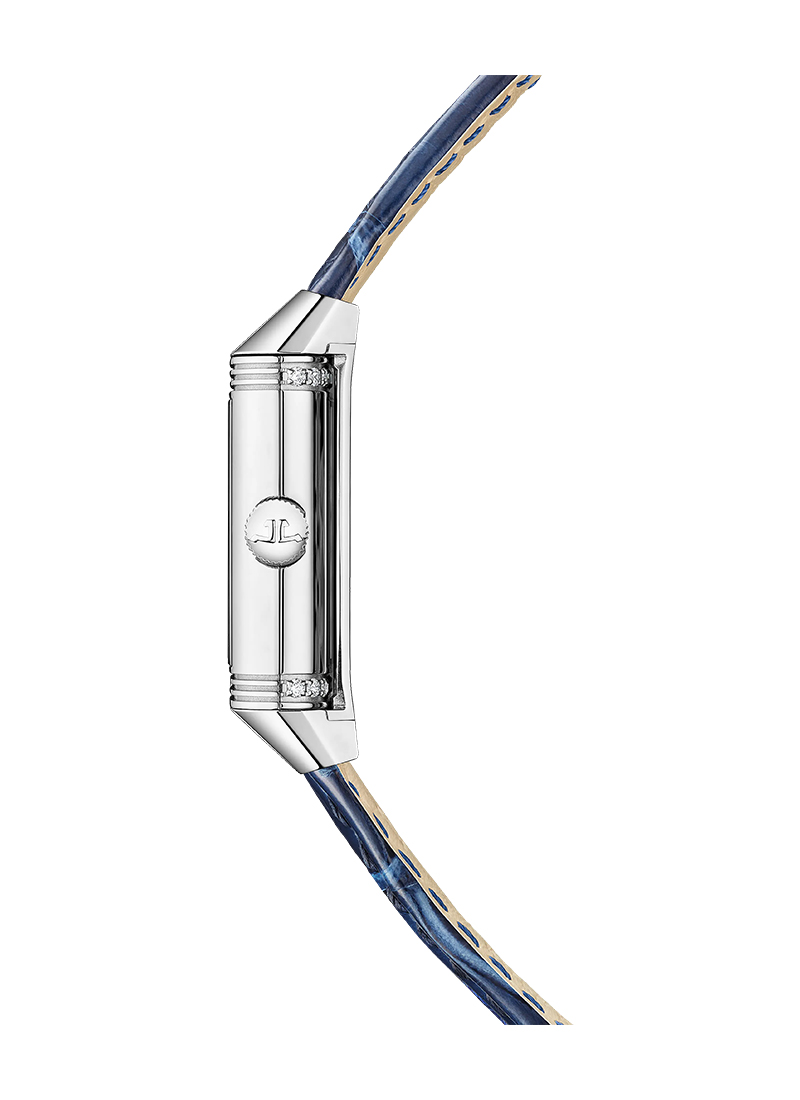モダンな趣が際立つステンレススチール製ケースと34.2 x 21 mmの絶妙なプロポーションが美しい、レベルソ・クラシック・スモール・デュエット。コレクションが受け継ぐタイムレスなデザインを、昼夜を映すダブルフェイスでエレガントに表現します。上品な佇まいが際立つ表ダイヤルには、ダイヤルおよびケースと調和する同系色のトーンでロゴとインデックスを配し、レベルソのデザインコードであるゴドロン装飾様式が、その輪郭を凛然と縁取ります。ケースを反転させると現れるのは、独創的なブルーの裏ダイヤル。インデックスには二本線を放射状に配し、中央に施したサンレイブラッシュ仕上げがダイヤルに奥行きと立体感を添えています。マニュファクチュール製手巻きキャリバー844が心臓部で鼓動を刻むこのタイムピースは、50時間のパワーリザーブを誇ります。タイムピースと優雅に響き合うブルーのアリゲーターストラップにはインターチェンジャブルシステムを採用し、装いやシーンに応じた異なる魅力で手元にさりげなく寄り添います。