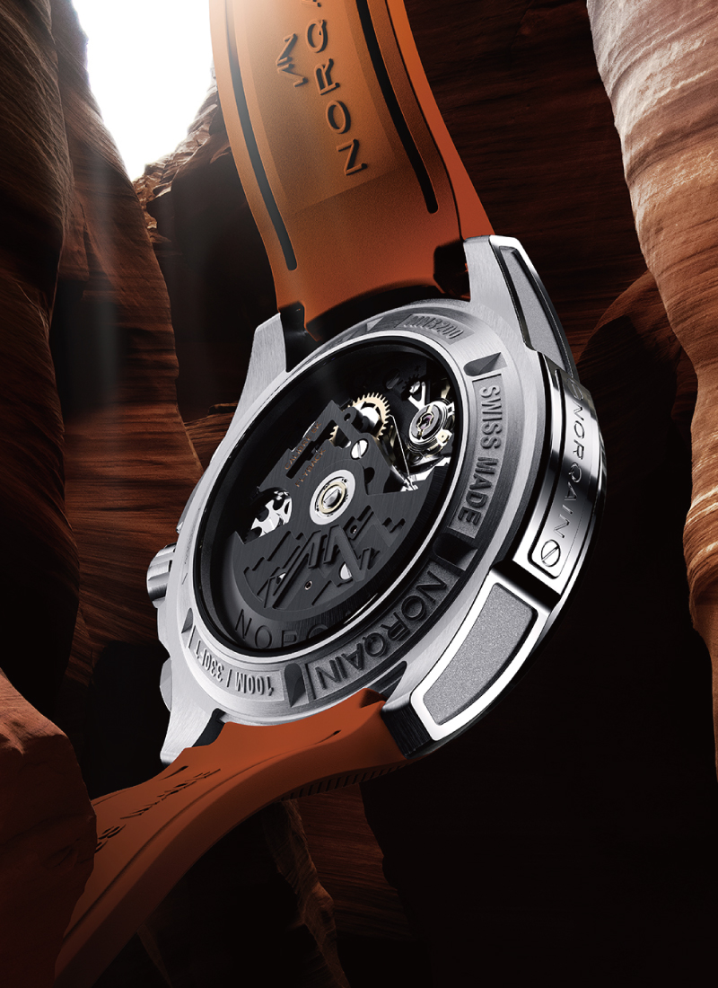 本モデルには、世界の標高8,000メートルを超える14座の山々に着想を得て名付けられた高性能ムーブメント NORQAIN 8K マニュファクチュール キャリバー が搭載されています。