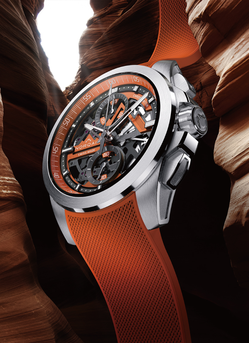 革新と探求の精神を体現するとともに、「My Life, My Way」というブランドのモットーを象徴するタイムピースです鮮やかなオレンジのスケルトンダイアルは、立体的で力強い表情を生み出し、ノルケインのDNAに刻まれた山並みのシルエットをさりげなく想起させます。