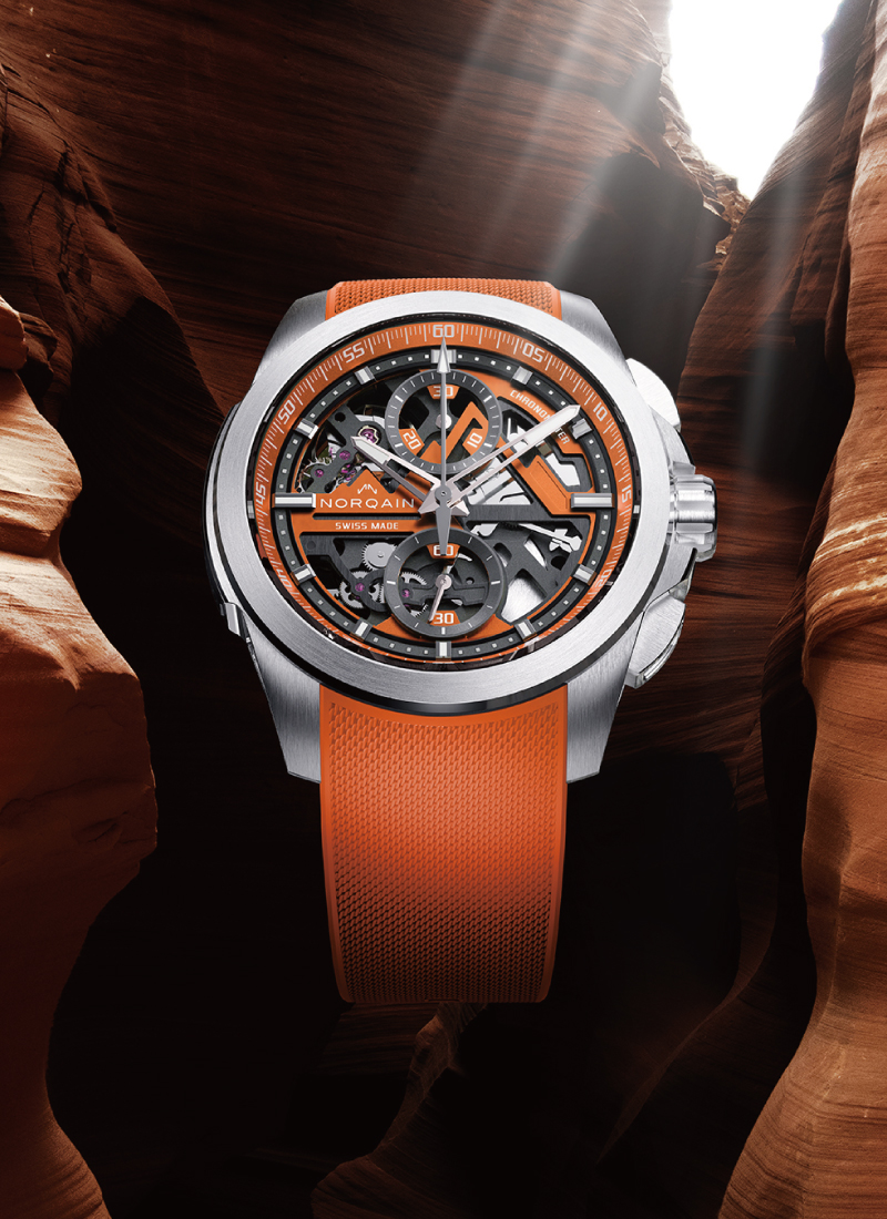 スイスの家族経営による独立系時計ブランド「NORQAIN-ノルケイン-」 は、ベストセラーモデル「インディペンデンス スケルトン クロノ42mm」から鮮烈なオレンジをまとった新色モデルを発表しました。