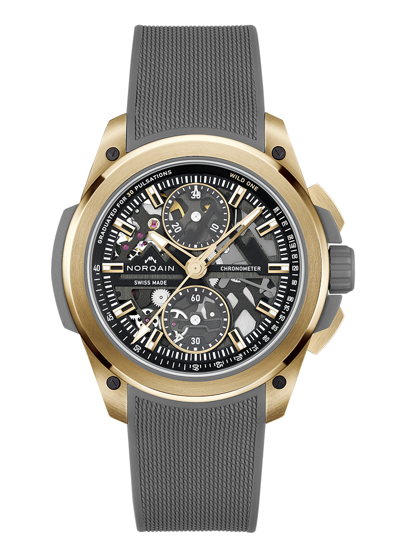 Wild ONE NHLPAは、NORQAINとNHL PA(ナショナルホッケーリーグ選手会)とのパートナーシップを2024年まで継続することを記念した限定モデル。このモデルは、マーブル模様が施されたブラックのNORTEQケースを採用しています。NORTEQ素材による保護ケージの間には、クロノメーター認定キャリバーNN20/1を内蔵するチタン製コンテナを覆う、ブラックラバー製のショックアブソーバーを備えます。このBIWI社製のショックアブソーバーには、アイスホッケーのパックに使われる素材が配合され、それにより独特のテクスチャーが創り出されています。ケースサイドには、同じブラックのNORTEQ素材を使用したNORQAINプレートを装備。ホワイトの「スクラッチドアイス」ダイアルは時計の存在感を高め、6時位置にブラックのNHLPAロゴを配置。時針、分針、秒針は、Independenceコレクションの他のモデルと同様に、スケルトン仕様。サファイアガラスのケースバックには、ロゴと限定モデルの証である「ONE OF 300」の文字をブラックプリント。このモデルには、ホワイトまたはブラックの「ミラネーゼ」構造が施された一体型ラバーストラップが用意されています。