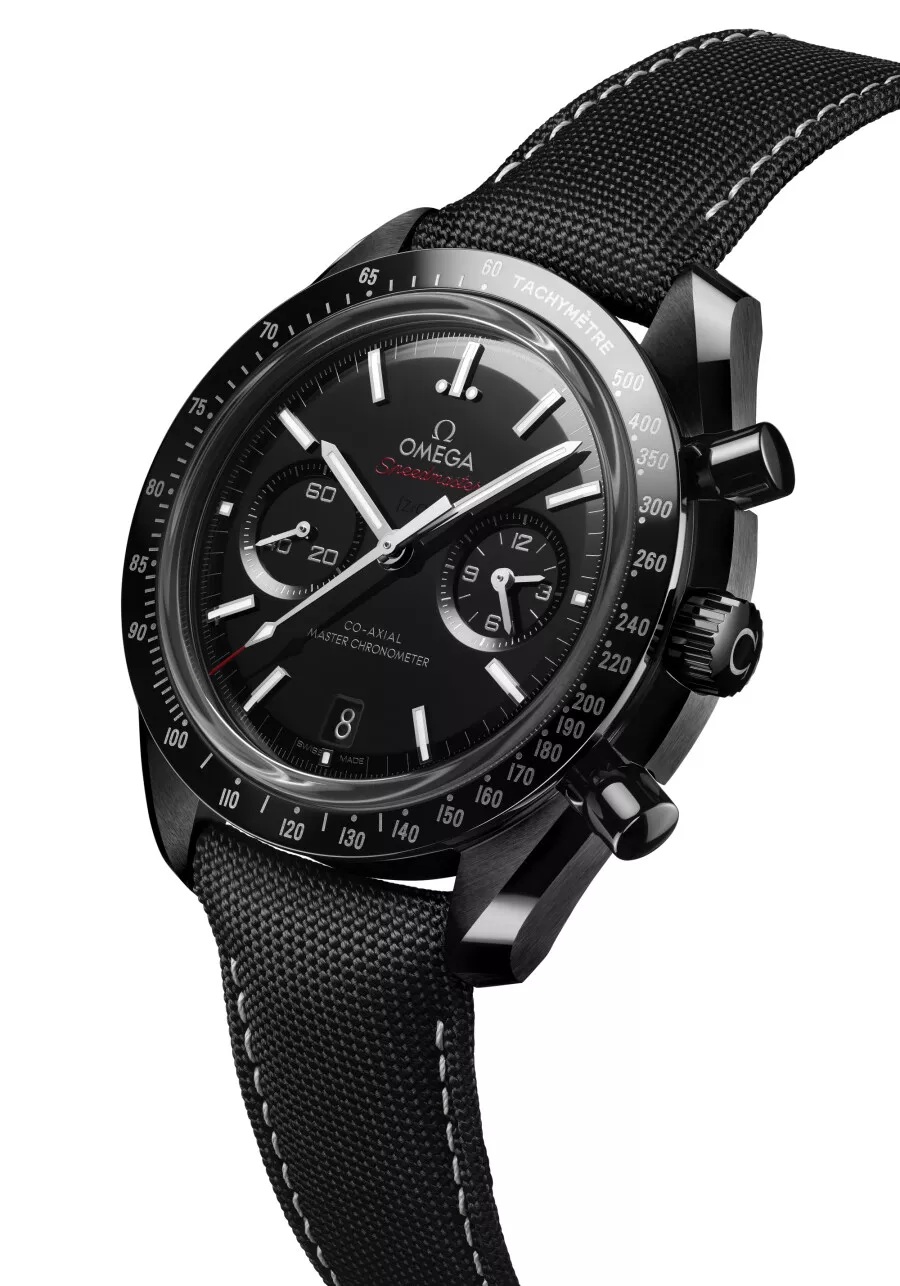 オメガ自動巻きコーアクシャル マスター クロノメーター キャリバー9900搭載。ブラックラバーのライニングをあしらい、セラミック製フォールディングクラスプとセラマイズドチタン製フレームスプリングフォルダーが付属するブラックのナイロン製ストラップで仕上げた、大胆なタイムピースです。