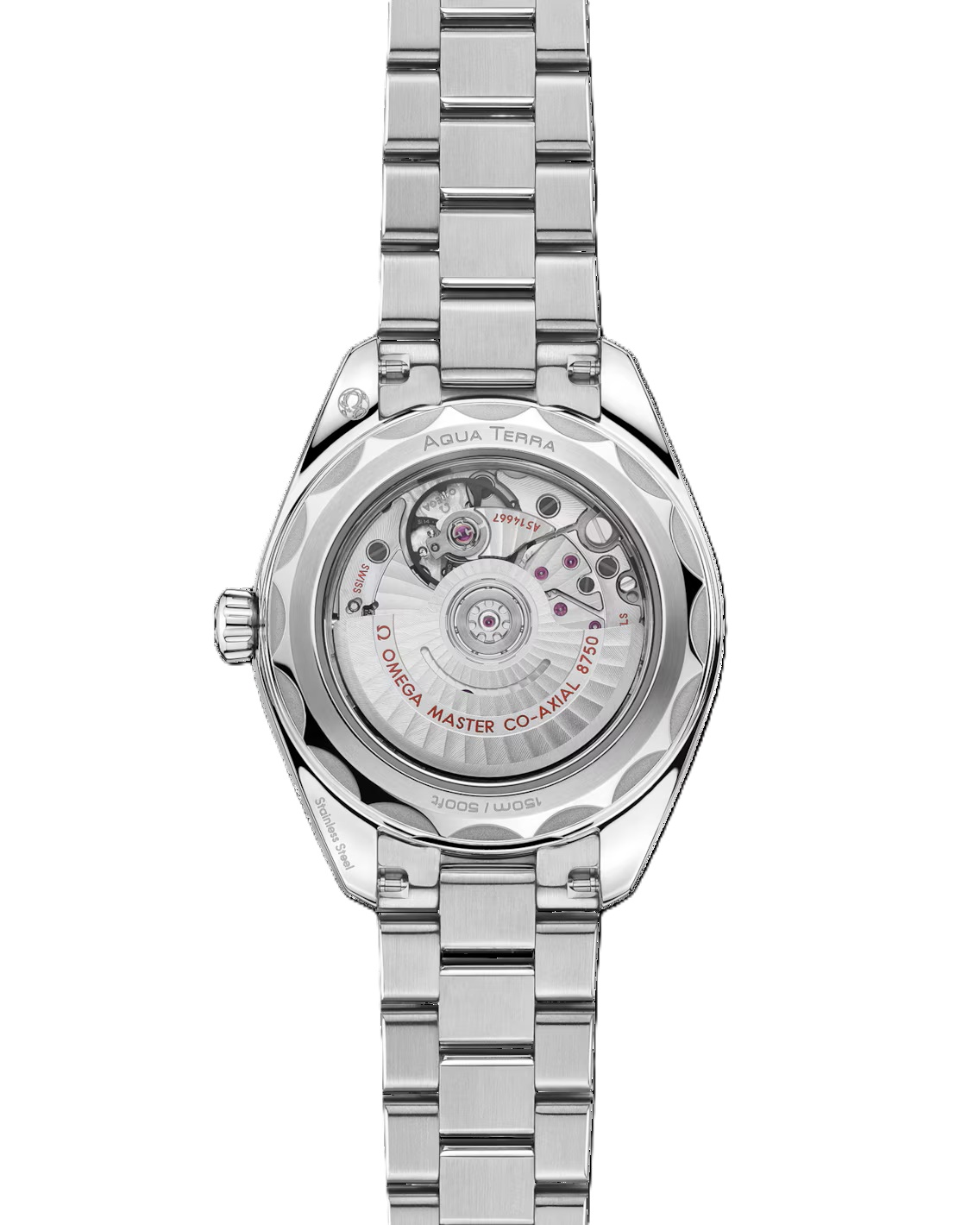 フォールディング バタフライクラスプとオメガのコンフォートリリースシステムが付いた、ポリッシュ&ブラッシュ仕上げが施されたラウンド型のコマから成るステンレススティール製一体型ブレスレットが合わせられています。