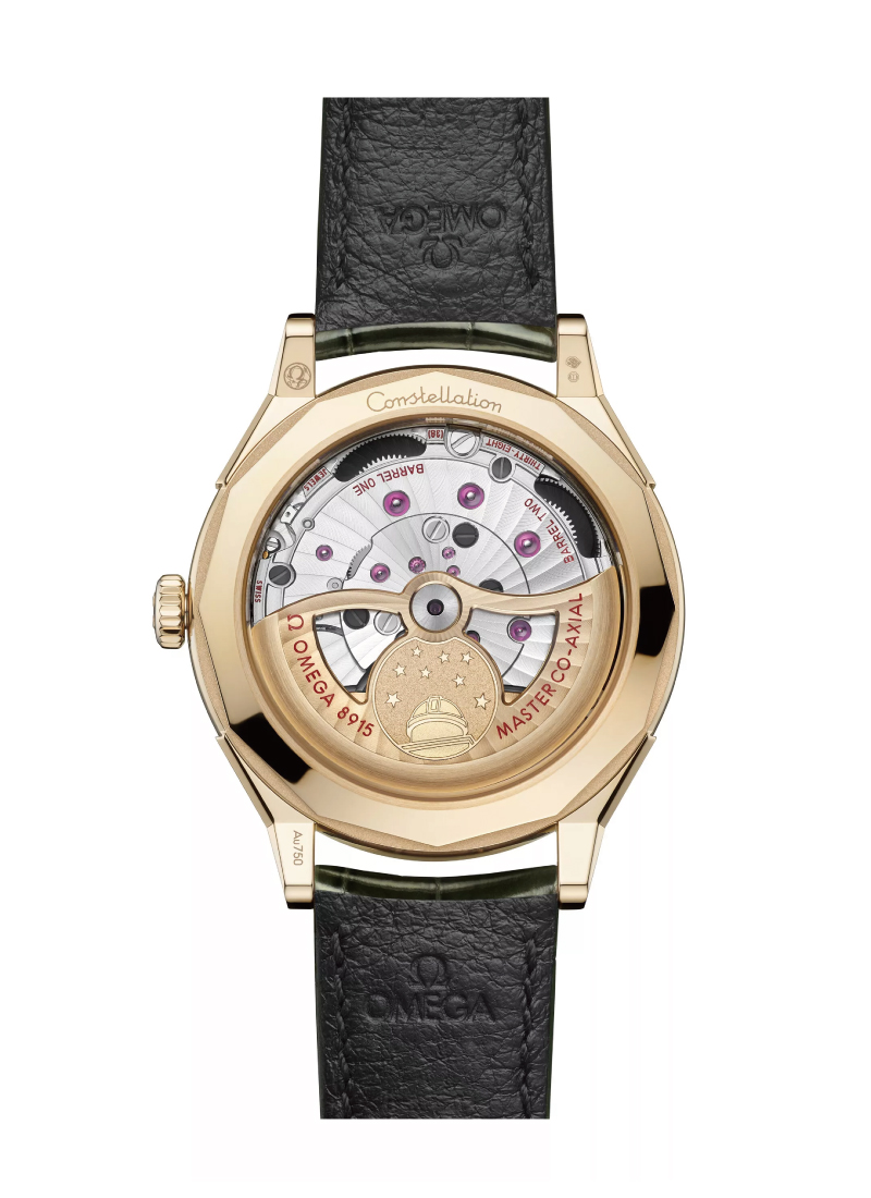 オメガ キャリバー8915搭載。METASによるマスター クロノメーター認定を受けた世界初の2針ウォッチです。サファイアクリスタルのケースバックからは、ムーブメントとともに、スケルトン構造の18Kムーンシャイン™ ゴールド製ローターを飾る、コントラストを成す仕上げを施した「コンステレーション」の天文台をレーザー加工であしらったメダリオンを見ることができます。「コンステレーション」の天文台がデザインされた特別なマルケトリボックスに収められています。