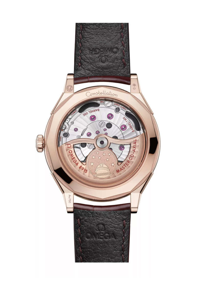 オメガ キャリバー8915搭載。METASによるマスター クロノメーター認定を受けた世界初の2針ウォッチです。サファイアクリスタルのケースバックからは、ムーブメントとともに、スケルトン構造の18Kセドナ™ゴールド製ローターを飾る、コントラストを成す仕上げを施した「コンステレーション」の天文台をレーザー加工であしらったメダリオンを見ることができます。「コンステレーション」の天文台がデザインされた特別なマルケトリボックスに収められています。