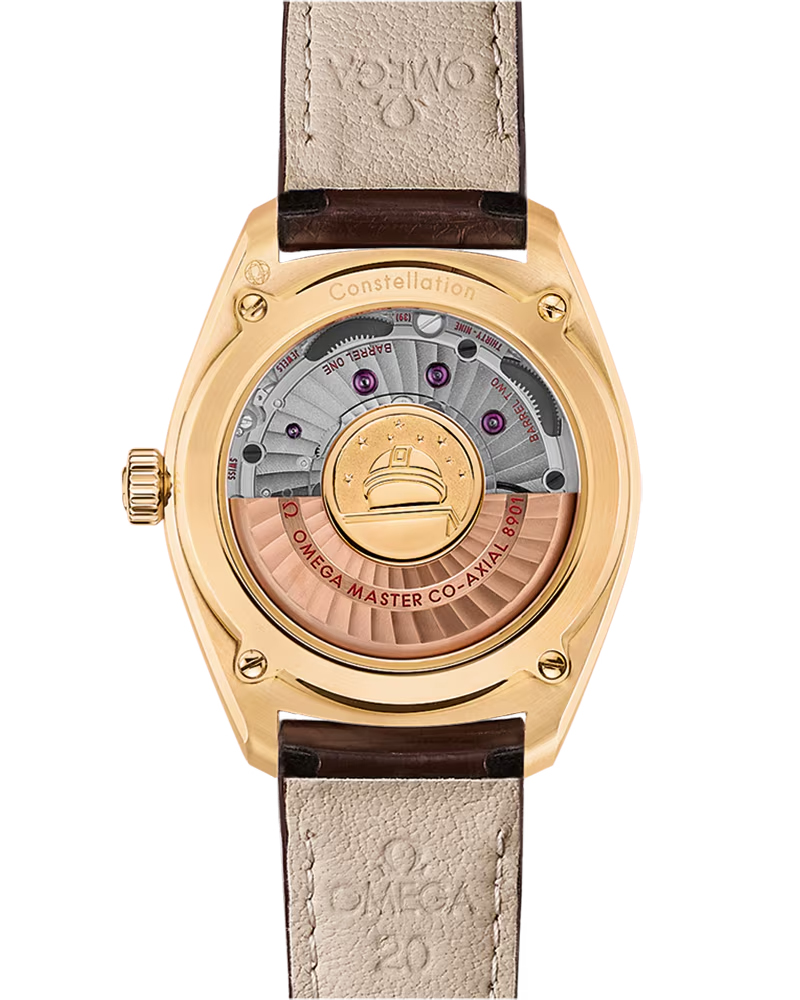 18Kイエローゴールドは「コンステレーション」の星、針、インデックスにも使われ、そこにはスーパールミノヴァがコーティングされています。そしてこのモデルに更なるエレガンスを与えるのがブラウンのレザーストラップと、裏蓋のサファイア・クリスタル ガラスの中にセットされた18Kイエローゴールド製の天文台のメダルです。