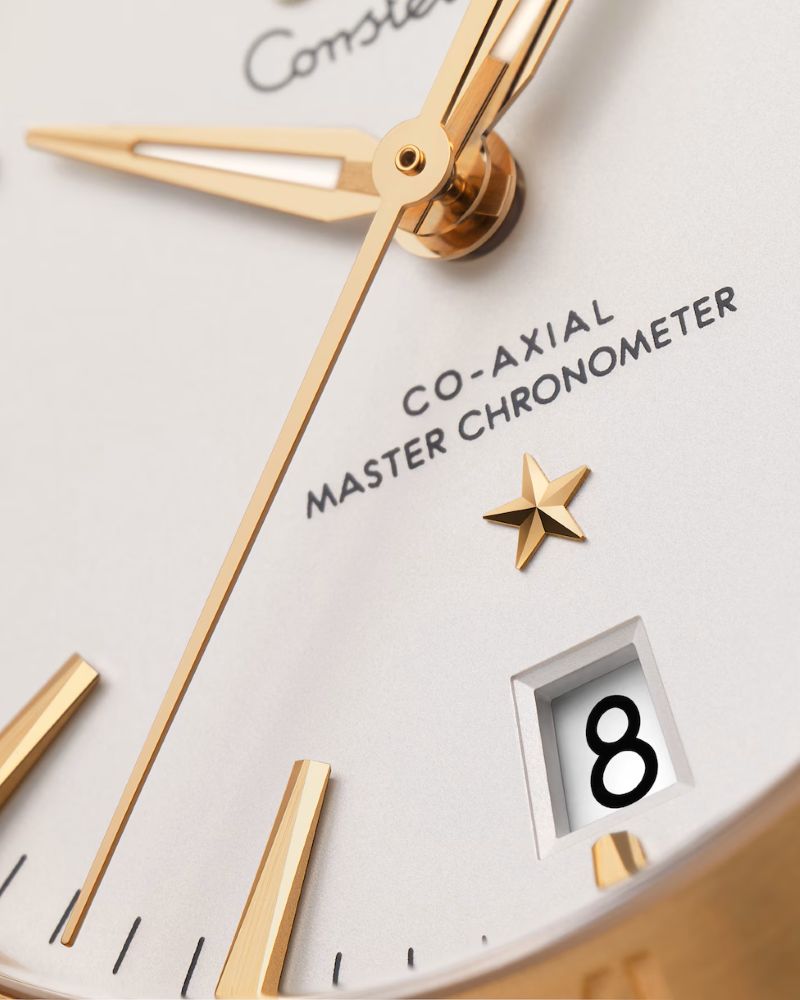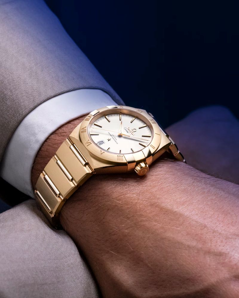 この39 mmの18Kイエローゴールド製モデルは、ローマ数字が刻印されたベゼルが印象的で、オパリンホワイトシルバーダイアルには、6時位置に日付窓があります。針、オメガロゴ、コンステレーションの「星」、インデックスにはいずれも18Kイエローゴールドが使用されています。