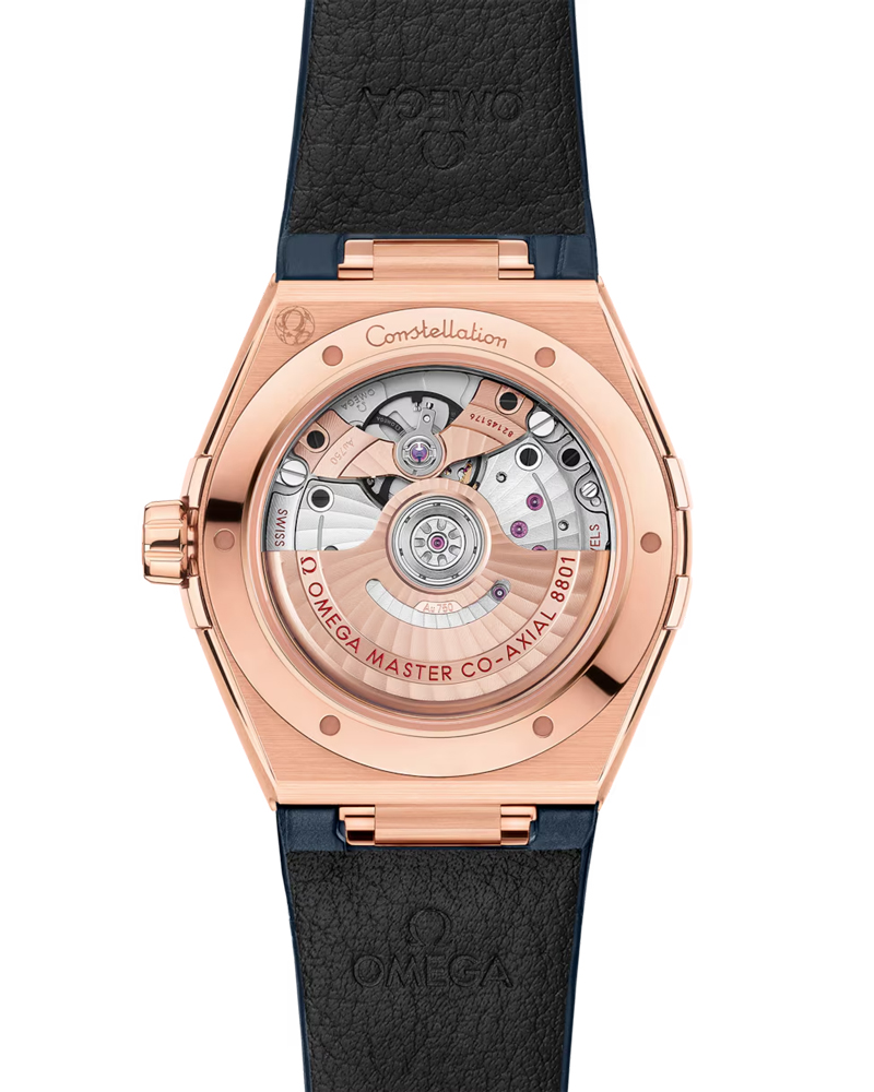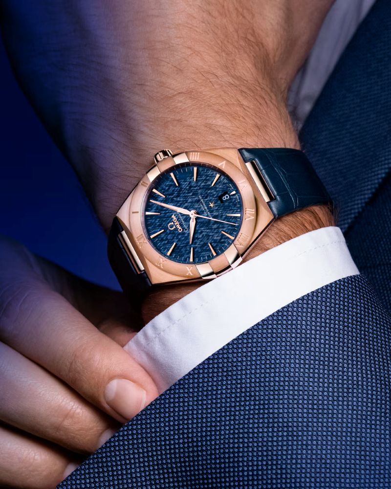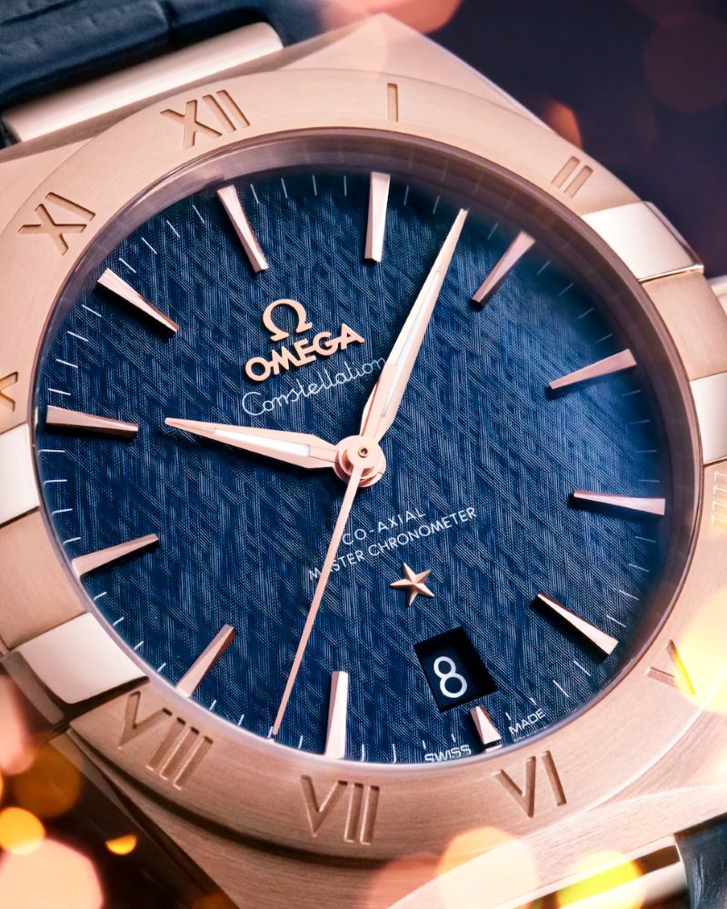 この39 mmの18Kセドナ™ ゴールド製モデルは、ローマ数字が刻印されたベゼルが印象的で、シルクエンボス加工のブルーのダイアルには、6時位置に日付窓があります。針、オメガロゴ、コンステレーションの「星」、インデックスにはいずれも18Kセドナ™ ゴールドが使用されています。