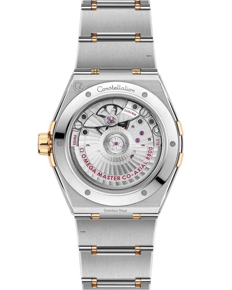 この39 mmのステンレススティール&18Kイエローゴールド製モデルは、ローマ数字が刻印されたベゼルが印象的で、オパリンホワイトシルバーダイアルには、6時位置に日付窓があります。針、オメガロゴ、コンステレーションの「星」、インデックスにはいずれも18Kイエローゴールドが使用されています。