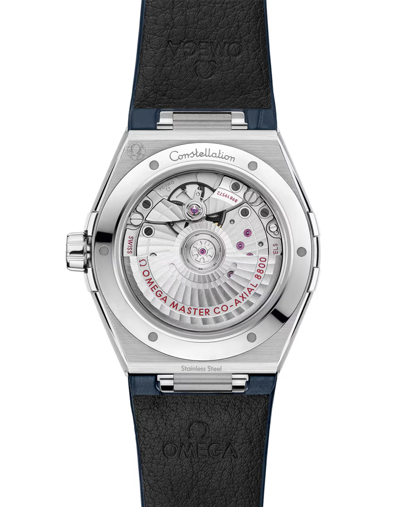 この39 mmのステンレススティール製モデルは、ローマ数字がブルーで施されたベゼルが印象的で、横方向に深めのサテン仕上げが入ったルテニウム製グレーダイアルには、6時位置に日付窓があります。針、オメガロゴ、コンステレーションの「星」、インデックスはいずれもブルーで仕上げられています。