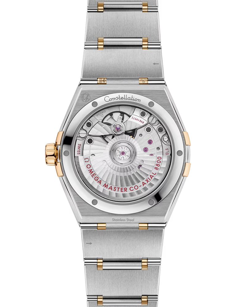 この36 mmのステンレススティール&18Kイエローゴールド製モデルは、ローマ数字が刻印されたベゼルが印象的で、ダイヤモンドインデックスがあしらわれたシルクエンボス加工のシャンパン色のダイアルには、6時位置に日付窓があります。針、オメガロゴ、コンステレーションの「星」、ダイヤモンドインデックスのベゼルには、いずれも18Kイエローゴールドが使用されています。