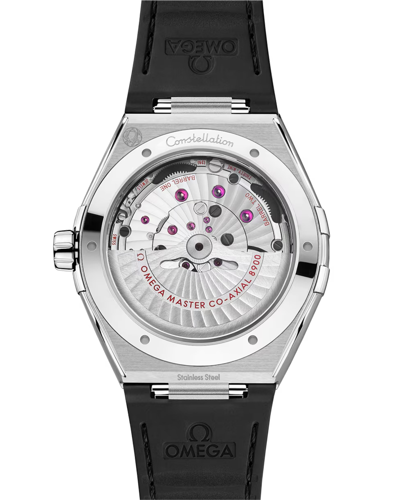 ラバーのライニングが施されたブラックのレザーストラップが付属するこのタイムピースは、オメガ コーアクシャル マスター クロノメーター キャリバー8900が搭載されており、傷のつきにくいドーム型サファイアクリスタルガラスから眺めることができます。
