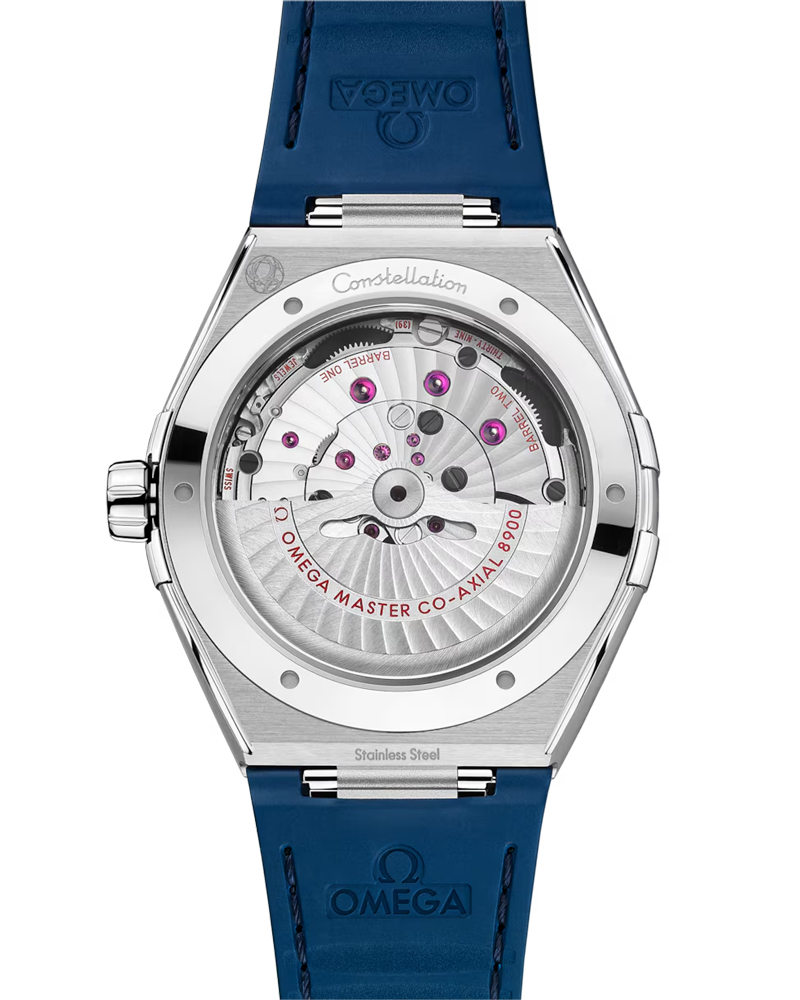 ラバーのライニングが施されたブルーのレザーストラップが付属するこのタイムピースには、オメガ コーアクシャル マスター クロノメーター キャリバー8900が搭載されており、傷のつきにくいドーム型サファイアクリスタルガラスから眺めることができます。