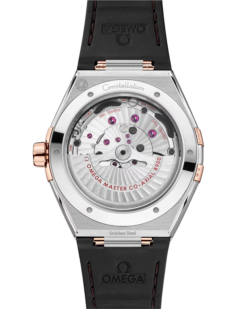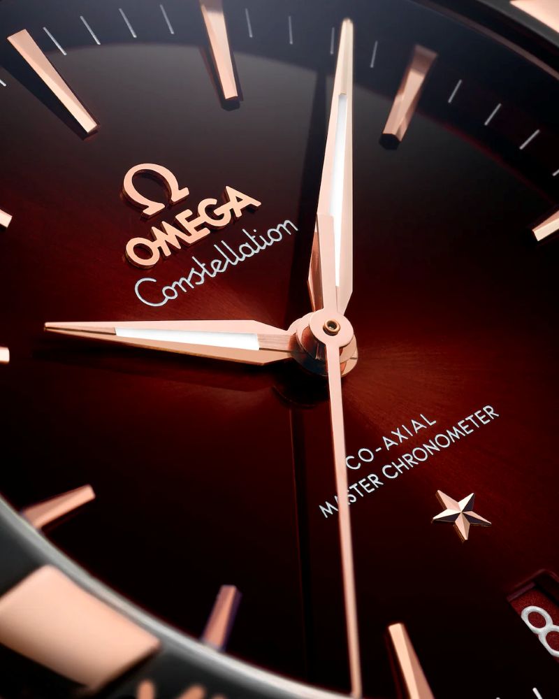 この41mmのステンレススティールと18Kセドナ™ゴールド製モデルには、オメガ セラゴールド™技術によるローマ数字を配したポリッシュ仕上げのブラックセラミック製ベゼルをセットしています。サンブラッシュ仕上げのダイアルは光沢感のあるラッカー仕上げで、バーガンディからブラックへと変化するグラデーションが特徴です。6時位置に日付表示を配し、針、オメガのロゴ、コンステレーションの「星」、ファセット加工されたインデックスにはすべて18Kセドナ™ゴールドが使用されています。