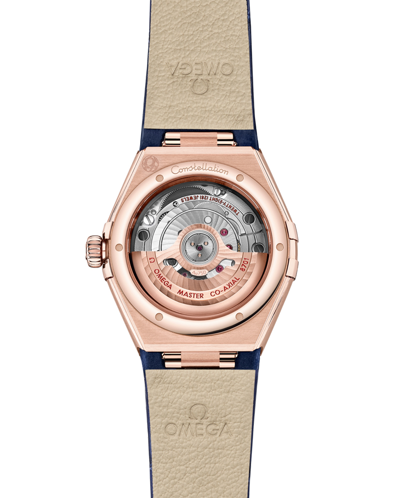 18Kセドナ™ゴールド製モデルは、ダイヤモンドがパヴェセッティングされたベゼルと、6時位置の日付窓を備えます。針、インデックス、オメガロゴ、そしてコンステレーションの「星」にも18Kセドナ™ゴールドが使用されています。