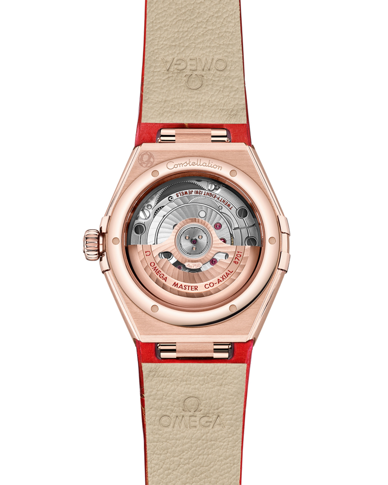 18Kセドナ™ゴールド製モデルは、ダイヤモンドがパヴェセッティングされたベゼルと、6時位置の日付窓を備えます。針、インデックス、オメガロゴ、そしてコンステレーションの「星」にも18Kセドナ™ゴールドが使用されています。