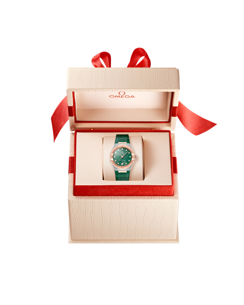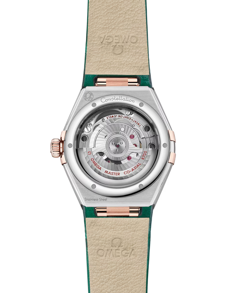 ステンレススティールおよび18Kセドナ™ゴールド製モデルは、ローマ数字が刻印されたベゼルと、6時位置の日付窓を備えます。針、インデックス、オメガロゴ、そしてコンステレーションの「星」にも18Kセドナ™ゴールドが使用されています。