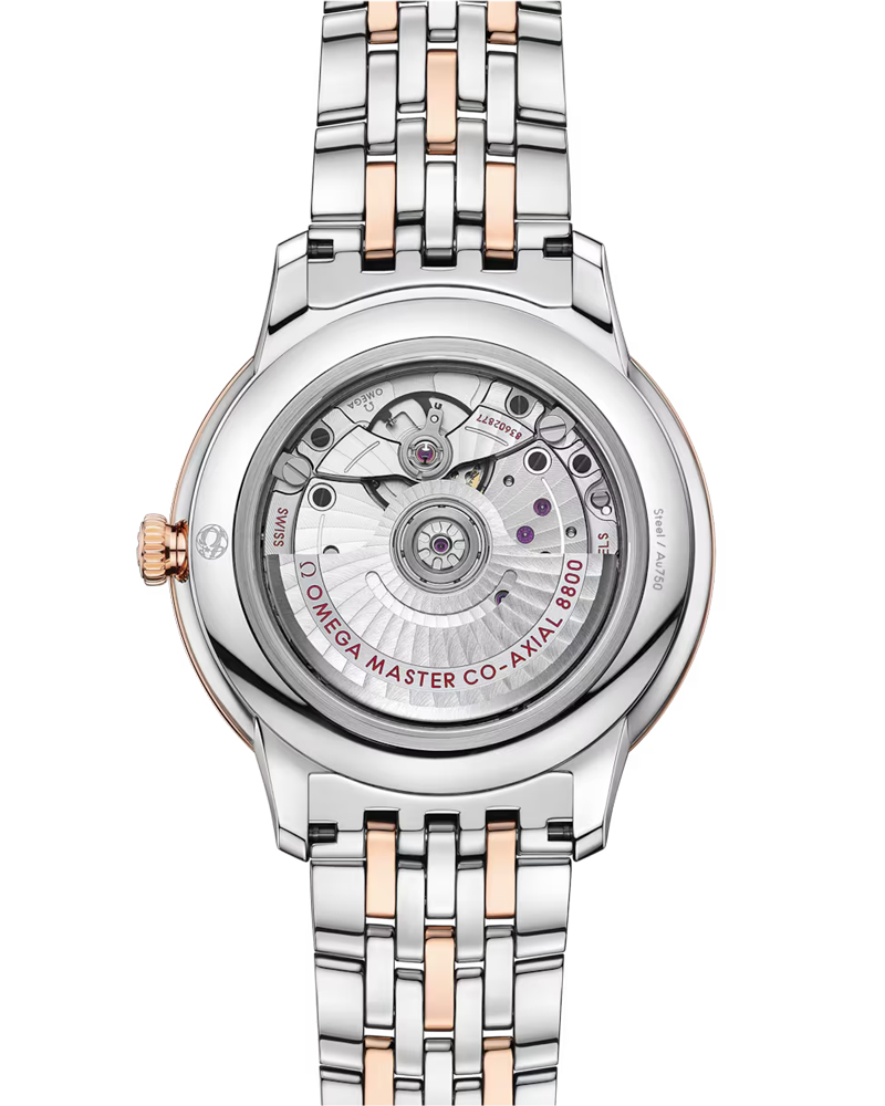 この直径40mmのステンレススティール&18Kセドナ™ゴールド製モデルは、ランダムなバーティカルパターンが型押しされたフラットなオパリン仕上げのPVDリネンカラーダイアル を備えています。また、PVD セドナ™ゴールド カラーの針と、18Kセドナ™ゴールド製ホルダーにセットされたダイヤモンドとローマ数字のインデックスが交互に配されています。