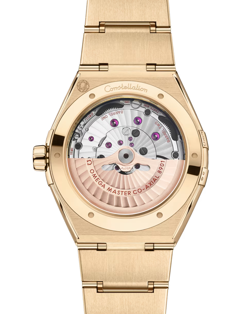 ケース径41mmのこのモデルは、18Kムーンシャイン™ ゴールド製のケースとリンクブレスレットを備え、ポリッシュ仕上げの爪、ハーフムーンファセット、レーザー加工によるポジティブレリーフでベゼルに施されたローマ数字など、「コンステレーション」のシグネチャーである特徴を継承しています。