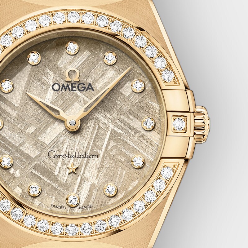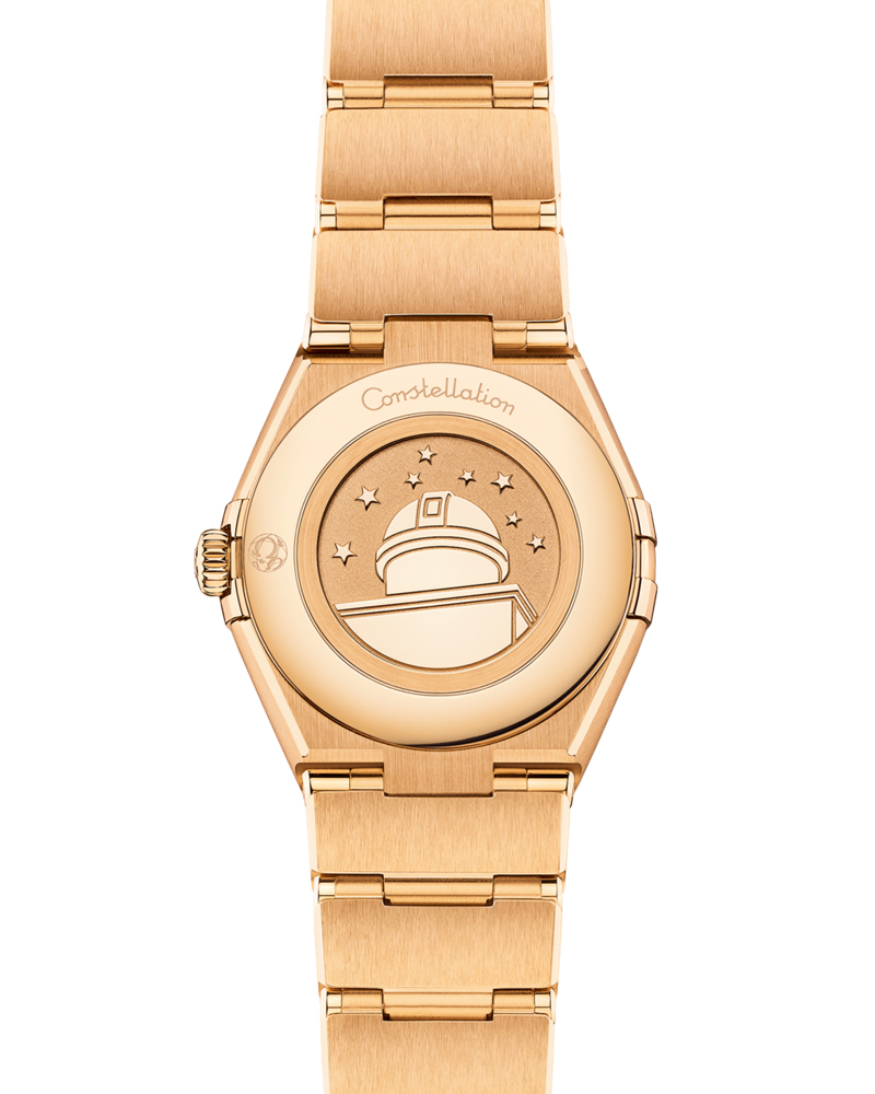 ケース径28mmのこのモデルは、18Kイエローゴールド製のケースとリンクブレスレットを備え、ポリッシュ仕上げの爪、ハーフムーンファセット、ダイヤモンドがパヴェセッティングされたベゼルなど、「コンステレーション」のシグネチャーである特徴を継承しています。