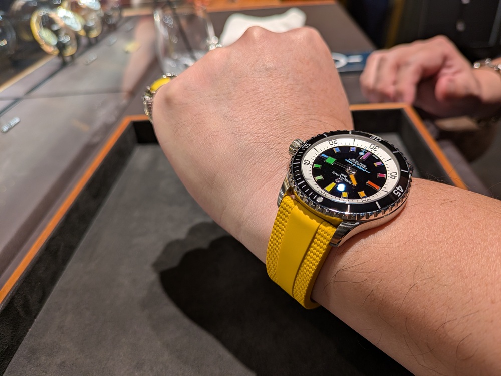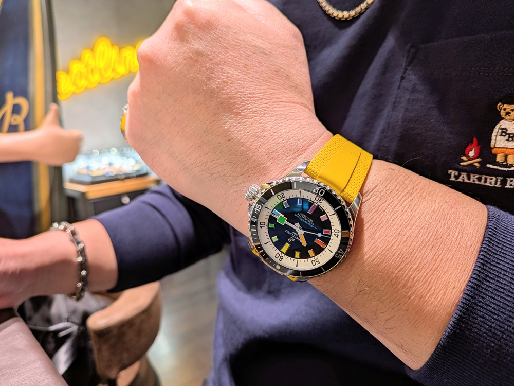 お待ちいただいている間にご覧いただいた、レインボーダイヤルのスーパーオーシャンをお迎えしていただきました!カラフルなインデックスや針と、目を惹くカラーのラバーストラップが、