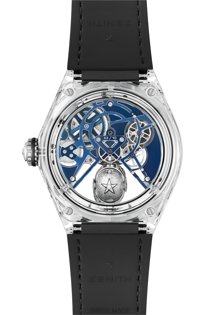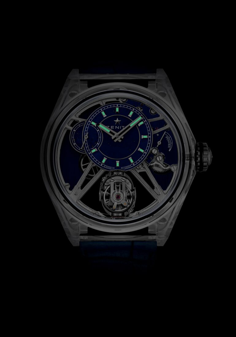 八角形の46mmフルトランスペアレント サファイアケースを備えた「デファイ ゼロ G」は、ジンバルを取り付けた「グラビティ コントロール」モジュールが際立ちます。これにより、重力の影響がリアルタイムで打ち消され、調速機構を水平に保つことができます。