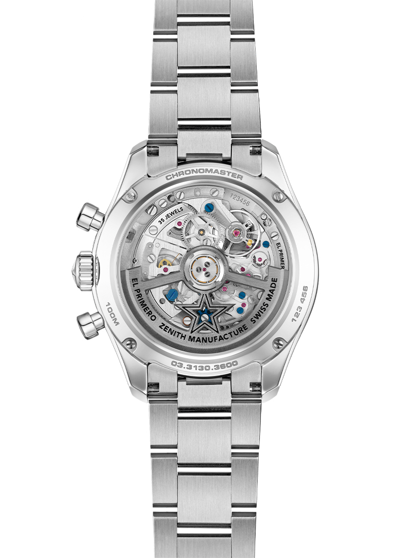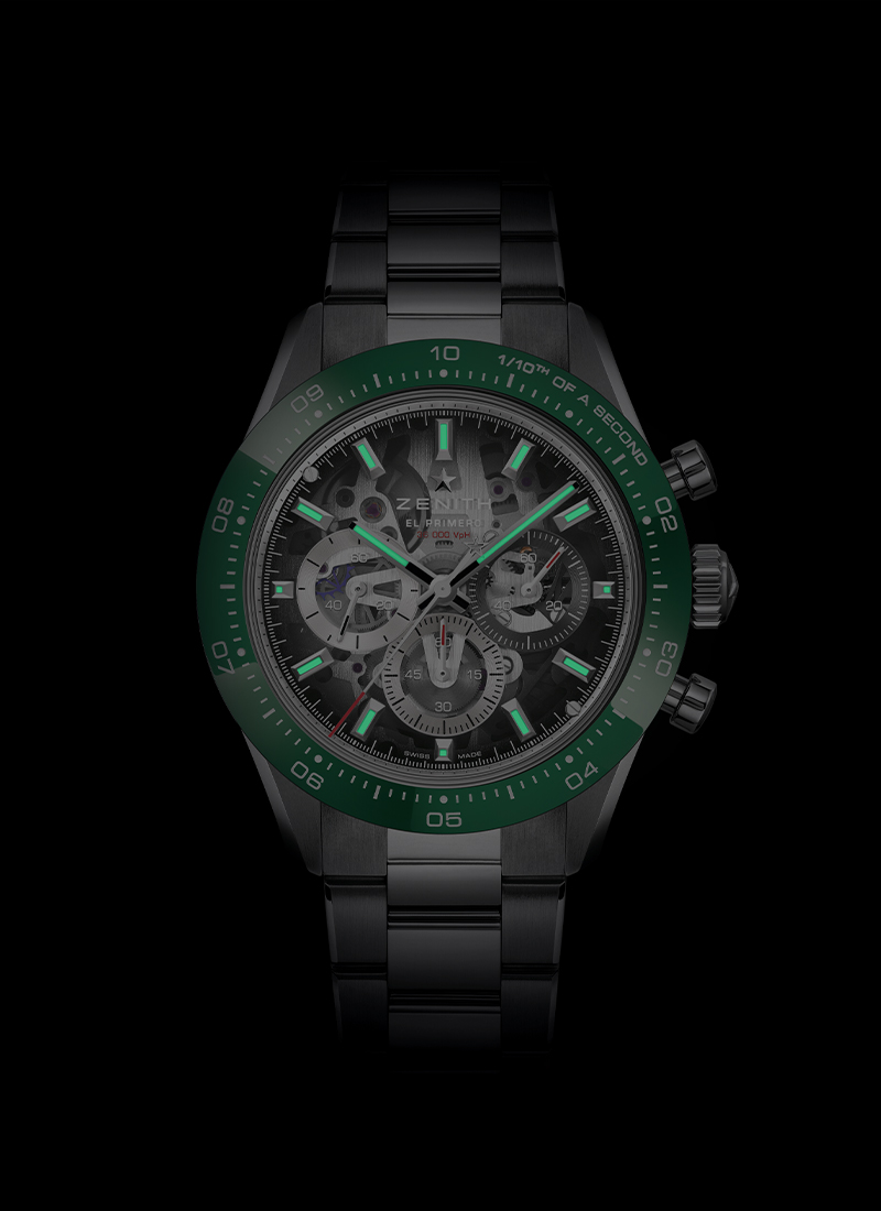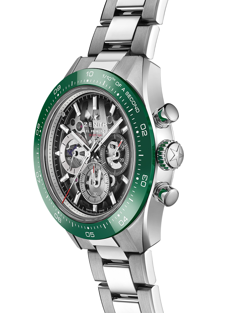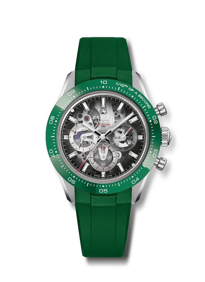 41 mmのステンレススチールケースを備える「クロノマスター スポーツ スケルトン」。クラシックなポンプ式プッシュボタンとモダンなグリーンのセラミックベゼルを組み合わせています。そのスモークサファイア文字盤は3色のグレーに彩られたカウンターを備え、1/10秒計測のクロノグラフ機能を備えた高振動コラムホイール式クロノグラフ 自動巻ムーブメント、エル・プリメロ 3600 SK キャリバーのスケルトン仕様を覗かせます。快適に調整できるフォールディングバックル付きスチールブレスレット、グリーンラバーストラップが付属します。