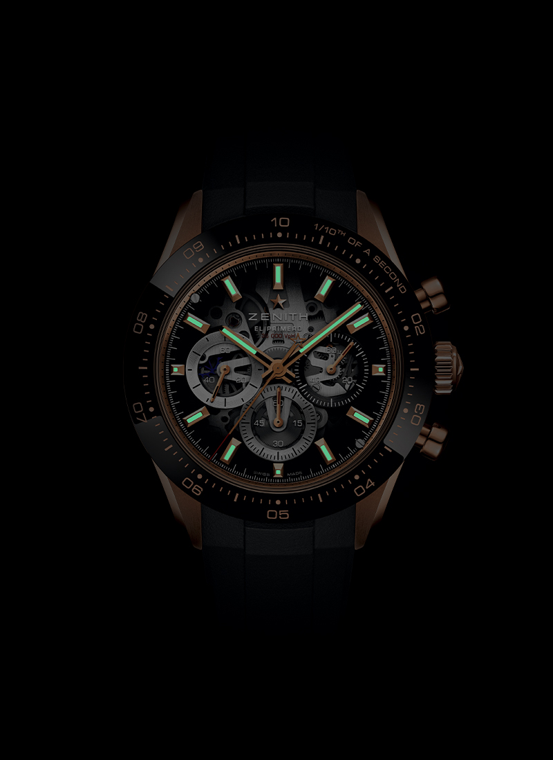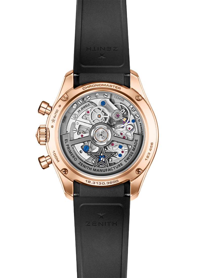 41 mmのローズゴールドケースを備える「クロノマスター スポーツ スケルトン」。ブラックセラミックベゼルとブラックラバーストラップを組み合わせたモデルです。そのグラデーションサファイア文字盤には、シグネチャーの3色カウンターがわずかに重なり合って配されています。1/10秒計測のクロノグラフ機能を備えたエル・プリメロ 3600 SK 高振動自動巻クロノグラフ ムーブメントをスケルトン仕様で見ることができ、約60時間のパワーリザーブを備えます。