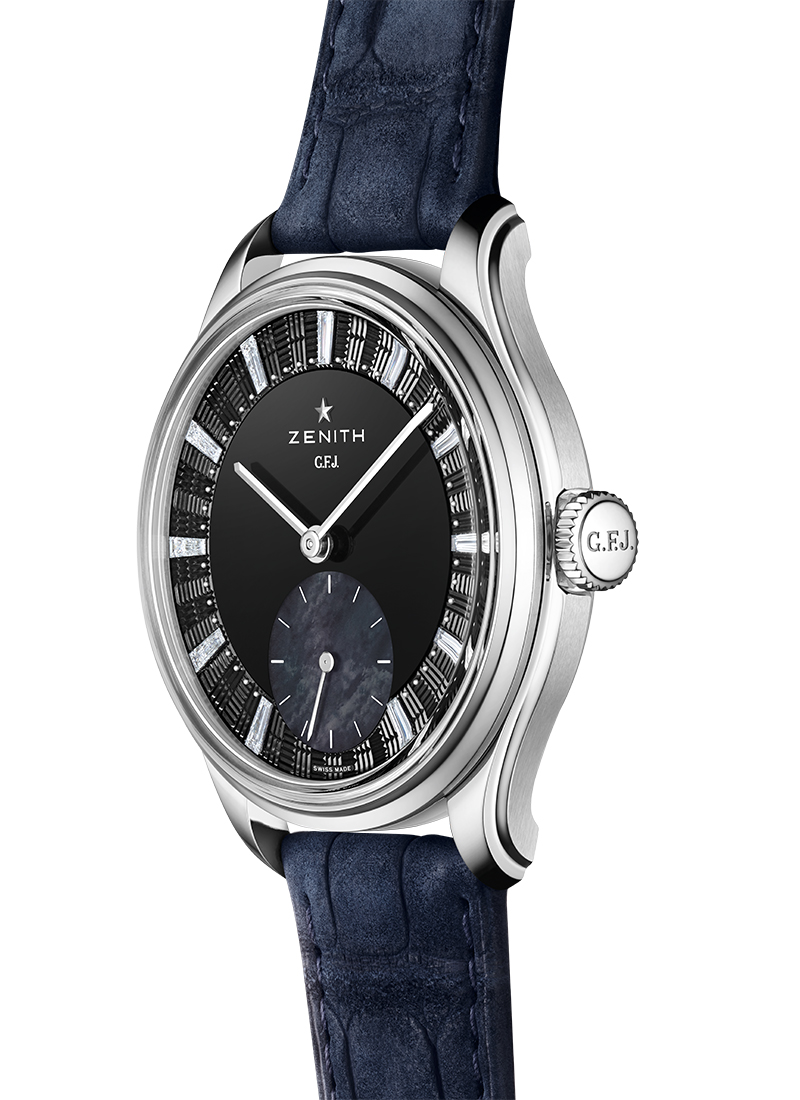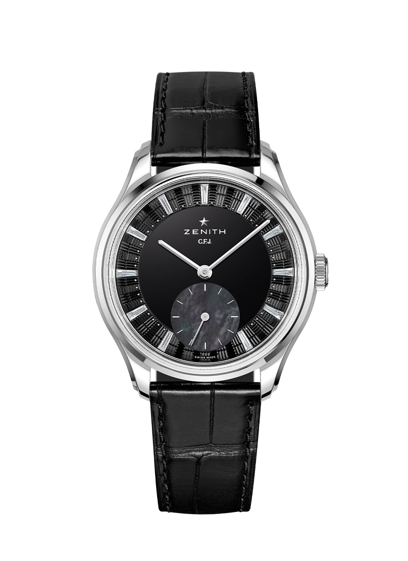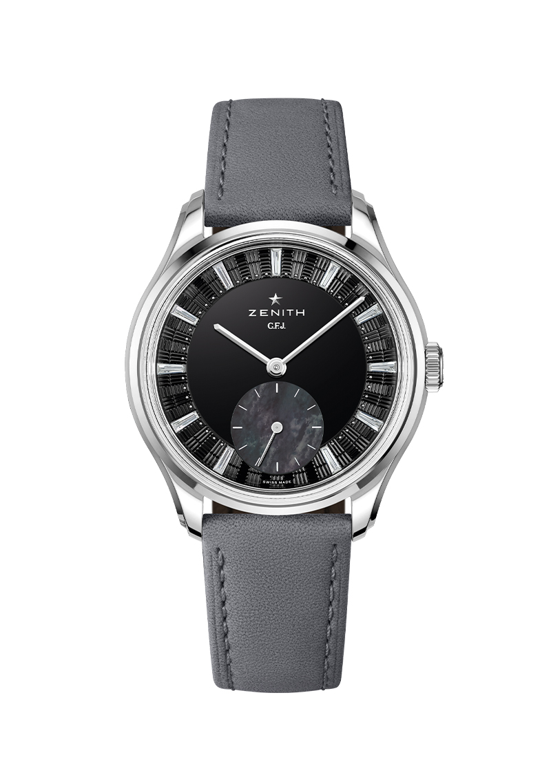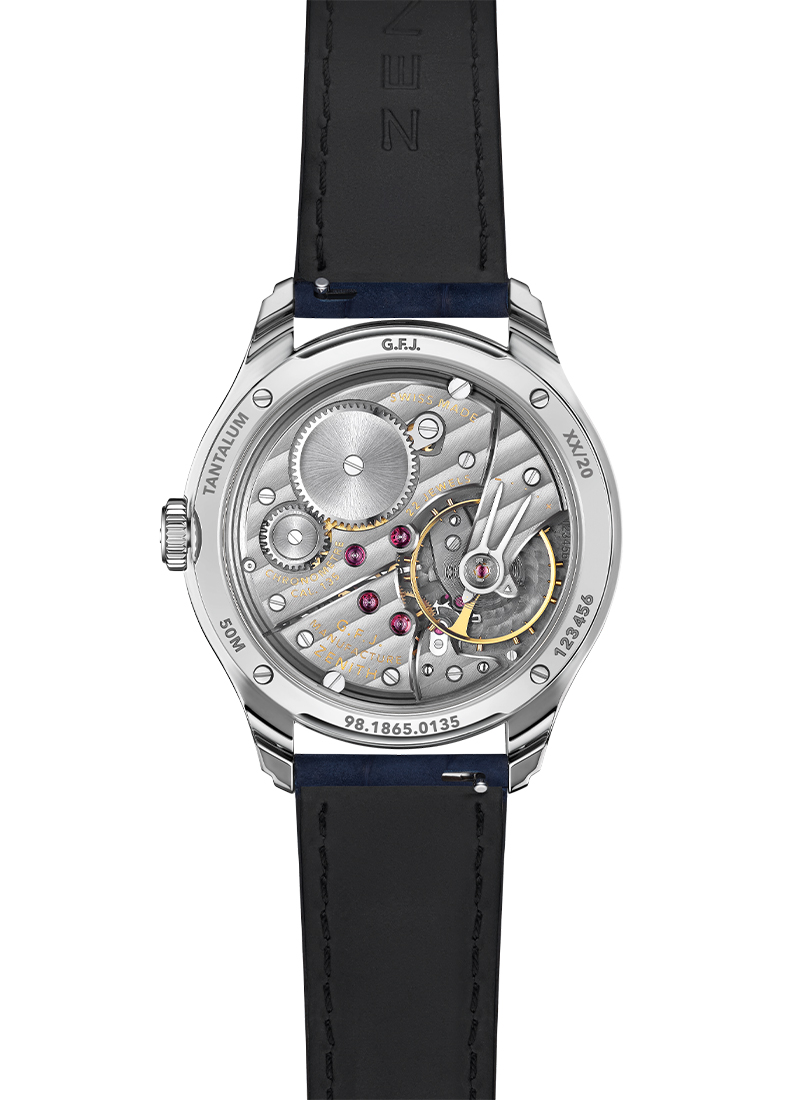 天文台によるクロノメーターコンクールの黄金時代に最多の賞に輝いたムーブメント、キャリバー135を蘇らせた「G.F.J.」。この伝説的なキャリバーは、本来のエッセンスを損なうことなく、信頼性、精度、全体的な性能を向上させるため、さりげなく見えるけれども重要な改良が施されています。限定モデルの39 mmのラウンドケースは、外観は控えめでありながら技術的妥協を許さない金属、タンタルで製作されています。3つのパートからなる深みのある文字盤は、ブラックオニキス、グレー マザーオブパール、ギョーシェ模様を組み合わせ、バゲットカットダイヤモンドが優雅なアクセントを添えています。ブルーのヌバックアリゲーターレザーストラップ、ブラックのアリゲーターレザーストラップ、グレーのカーフレザーストラップが付属します。