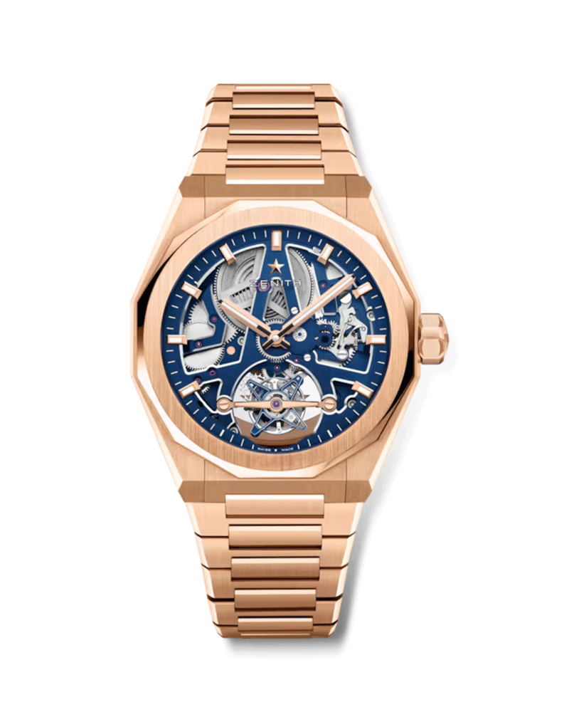 デファイ スカイライン スケルトンでは、ファセットカットのベゼルを配した41mmスチール製の八角形のケースを使用し、ブルーのオープン文字盤にはゼニスの象徴である4つの点を結んだ星を復刻させてあしらっています。1/10秒精度を誇る初のインジケーターを備えた高振動エル・プリメロ 3620 SK 自動巻スケルトンムーブメントを搭載。クイックストラップチェンジ機構を備え、スチール製ブレスレットとブルー パターンのラバーストラップが付属。